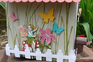 The house has a little door and mailbox, a white picket fence, a window box and an adorable chimney on top of a slate roof. I used the Inspired by Nature set to stamp the grass on all sides of the house.