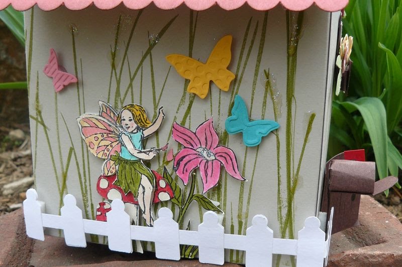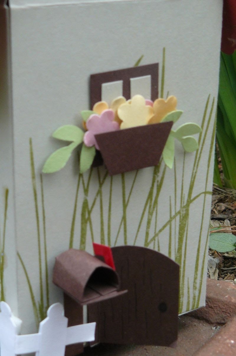 The house has a little door and mailbox, a white picket fence, a window box and an adorable chimney on top of a slate roof. I used the Inspired by Nature set to stamp the grass on all sides of the house.
