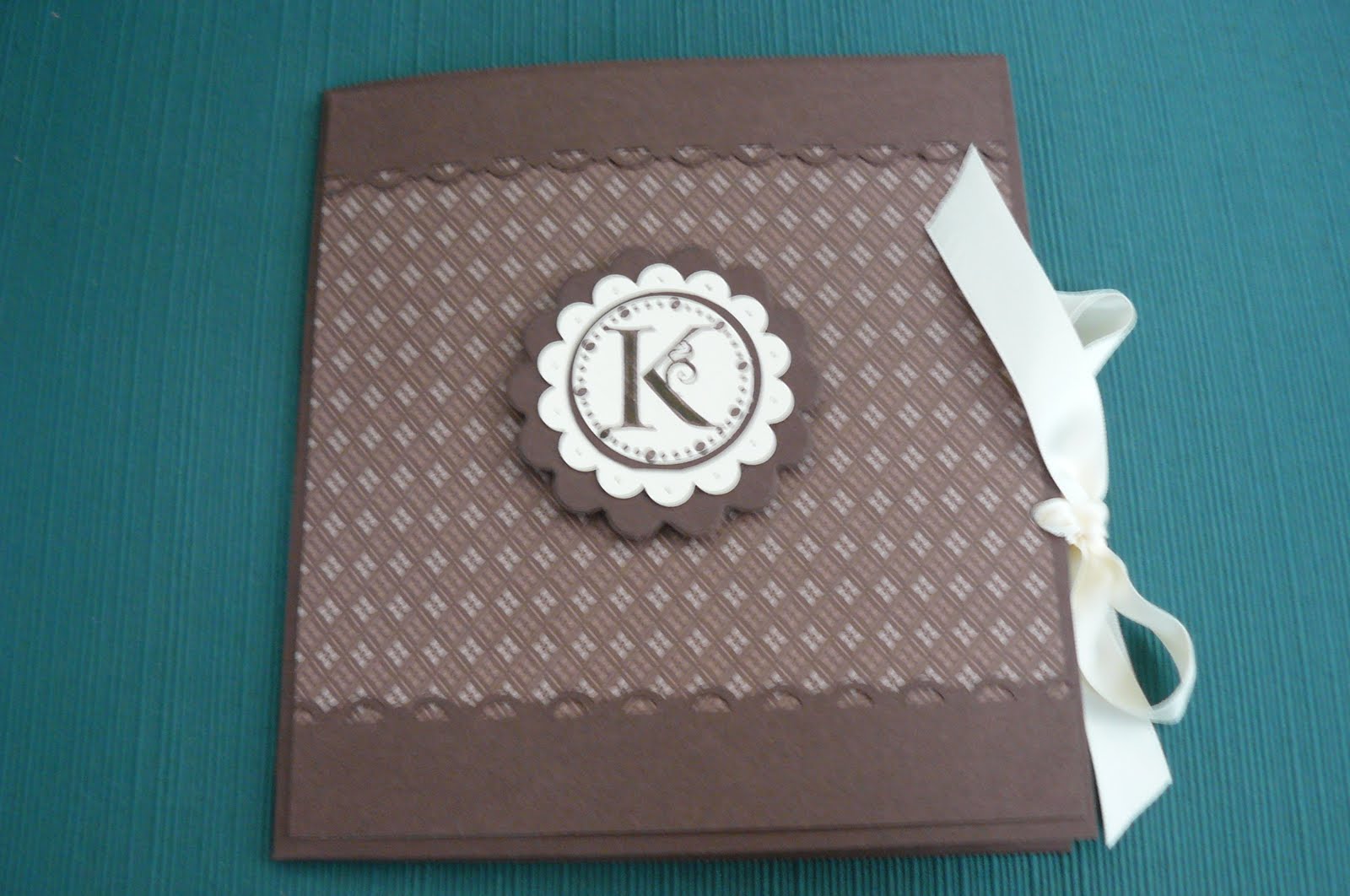 Now you’re ready for the last step: attaching the monogram to the front of the portfolio as well. I used my Big Shot and the Pennant Die to punch out the largest scallop circle. You’ll see 3 circles on the Pennant Die — 2 of the 3 have a score line through them so they’re not the best choice for your front. After you’ve cut out your scallop round, pop it up with Dimensionals, and attach the 5th monogram that you saved from the previously stamped letters (remember, you used 4 for the stationary and saved a 5th for the cover). Below, you see these two steps.