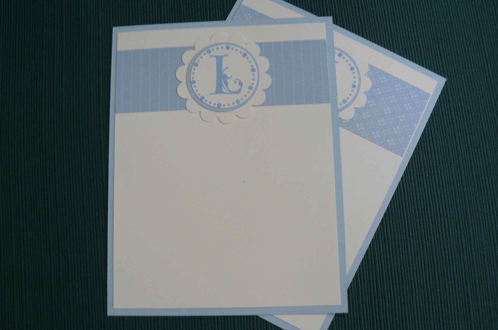 Once I stamped the monograms, I used my 1 1/4″ round punch to punch out the circles. The 1 3/8″ round punch was used to punch out my colored cardstock circle, and then I again used my Scallop Round Punch to make my largest circle. When stamping, make 5 of these monograms at a time in your color choices: 4 for the stationary, and one for the outside portfolio. One step that I didn’t show is the paper-piercing that I randomly (meaning sometimes I remembered to do it before attaching to my stationary, and many times I didn’t!) pierced each scallop. For this, you need your Paper Piercer and your Mat Pack.