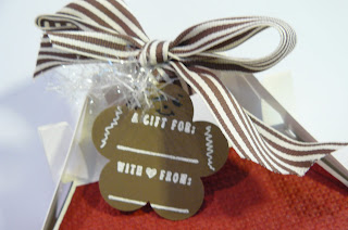 My first 2 projects are perfect for packaging and delivering homemade goodies for the holidays! I made a small cranberry nut bread and created a bread wrap to showcase it. It’s a strip of Candy Lane DSP, then 2 punched strips of white cardstock that are matting my stamped and embossed snowflakes on the wrap. I again stamped the snowflake on a scrap of white card stock and punched it out with the 1 1/4″ round punch. A small 1 3/8″ round punched circle mats the snowflake, and then the smaller scalloped round punch made up the bottom layer of my tag. This layered perfectly on my Whisper White tag using the 2 Tags Bigz die, that I stamped with the gift tag stamp from the stamp set. Don’t you love the Crystal Blue brad from the Circles Ice Rhinestone brads? To tie the bread, I used a length of the Clear Tinsel trim. (I’m sorry you can’t really see that in the photo.)