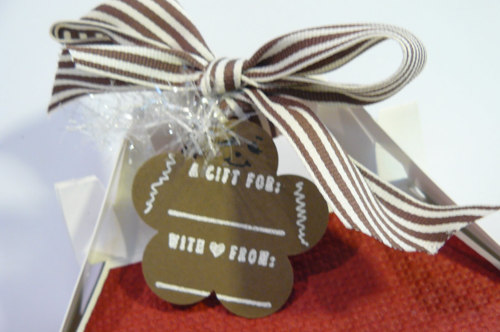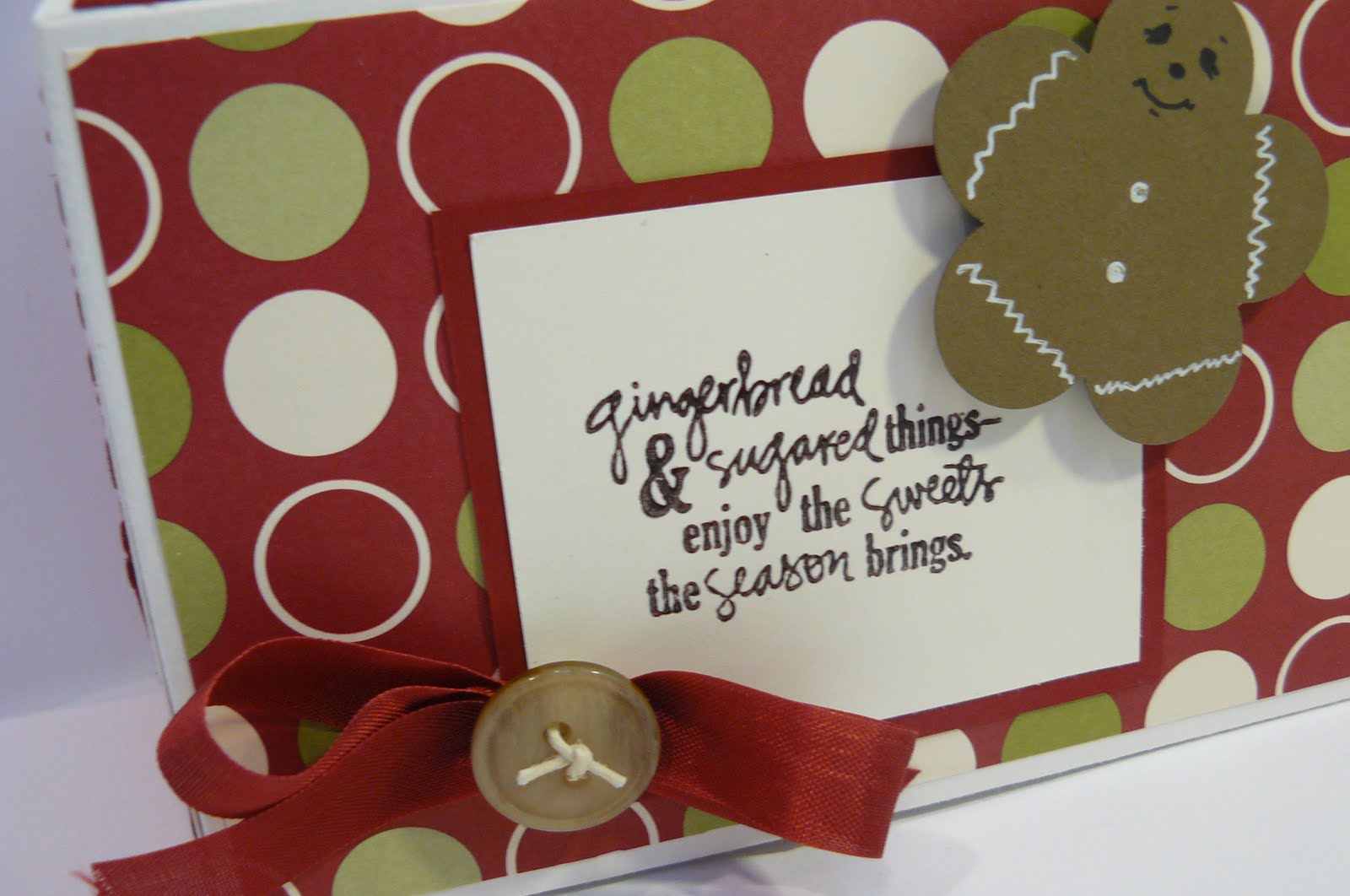 Guess how I made the little gingerbread men for my gift tag and my accent?!! As soon as I purchased the Fancy Flower Extra Large Punch, I envisioned a gingerbread man! I drew in his facial features with a black marker, and the icing “buttons” and trim are done with the Signo Gel pen. A Cherry Cobbler seam binding bow is the perfect accent in the lower corner of my box. I used some linen thread to attach my Deck the Halls Big Designer Button to the bow. To the top of the box, I tied a wide grosgrain (this is Chocolate Chip, but it would look just as lovely with the Early Espresso color!) ribbon bow. What I discovered is that this box could hold either a bunch of cookies, or even a mini holiday bread! Maybe we could fill it with stamps and ribbon for a special customer?! Hmmm…. I wonder what else I could put in there?!!