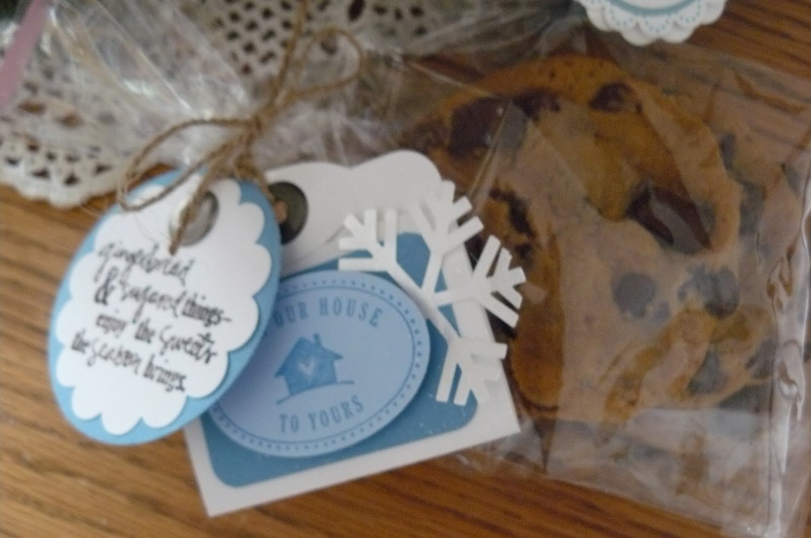 I made two tags for this yummy bag! First, I made a tag using the 2nd tag from the 2 Tags Bigz die. Inside (sorry, I guess I didn’t take a photo of the inside of the tag!) I stamped the “gift tag” sentiment, “For ____ with love from ____. ” I layered a punched oval stamped with Marina Mist on a Bashful Blue scrap, then popped it up with Dimensionals on a scrap of Marina Mist card stock. A punched Whisper White Snowflake that I sprayed with some “homemade” glimmer mist paint spray gives a little shimmer to the snowflake. My second tag for the cookies uses the cute Gingerbread sweets sentiment — I punched a round circle of Marina Mist card stock using my 2 1/2″ round punch, then stamped my sentiment on white card stock and punched it out using the larger new round scallop punch. 2 jumbo Antique Brass eyelets enable me to thread my linen thread through and attach the tags to the cookie gift.