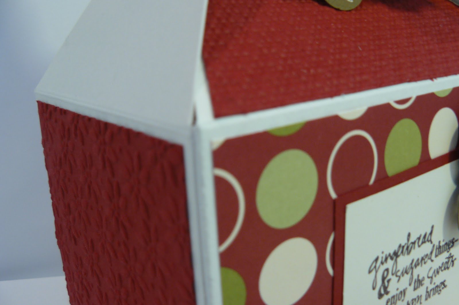 I love this small gable gift box. It is 4″ x 6″ x 6″ high. I honestly don’t remember where I purchased this box, but I sure do wish I had more! I attached some lovely patterned Jolly Holiday DSP to the large sides of the box.