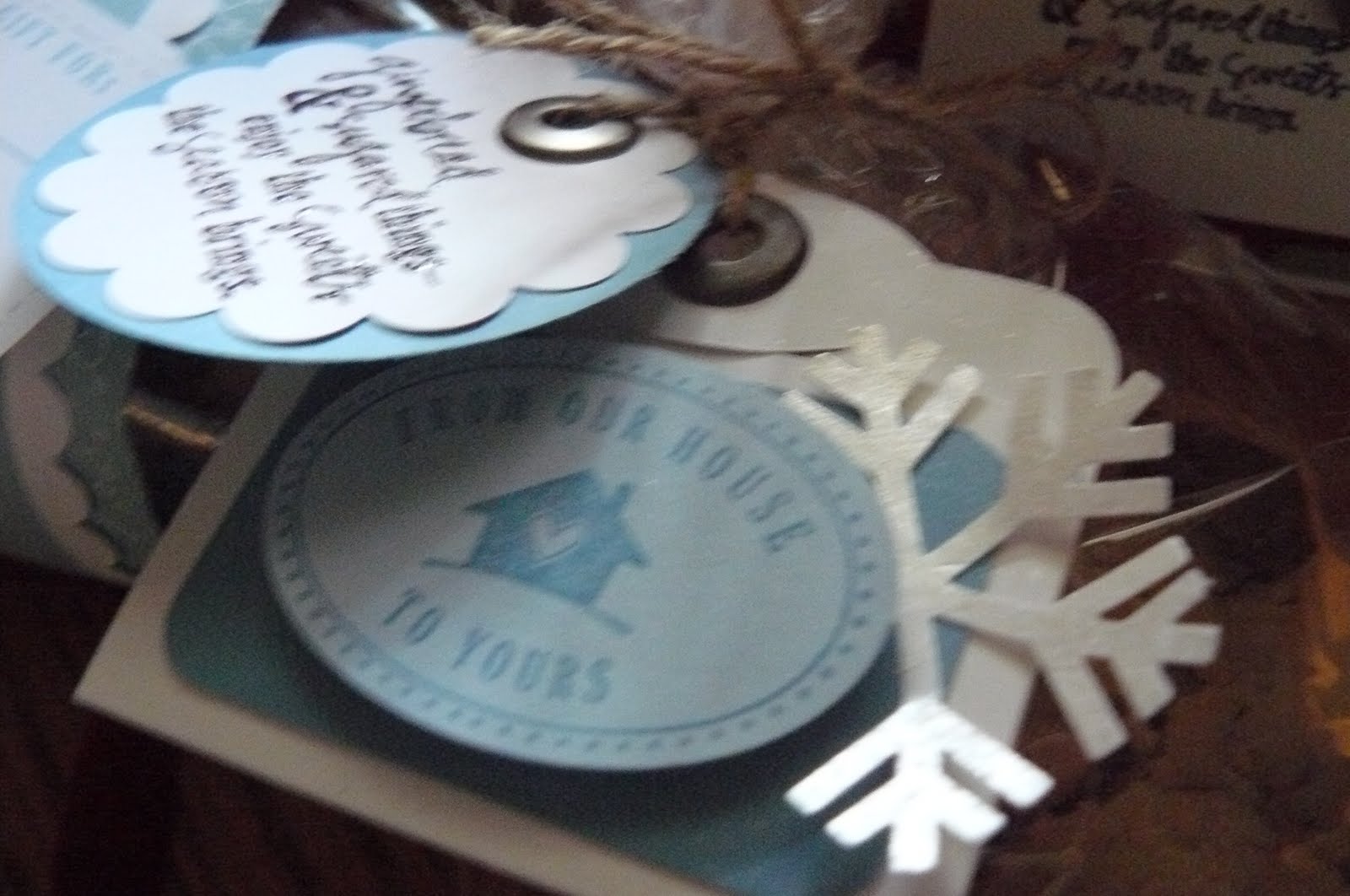 My first 2 projects are perfect for packaging and delivering homemade goodies for the holidays! I made a small cranberry nut bread and created a bread wrap to showcase it. It’s a strip of Candy Lane DSP, then 2 punched strips of white cardstock that are matting my stamped and embossed snowflakes on the wrap. I again stamped the snowflake on a scrap of white card stock and punched it out with the 1 1/4″ round punch. A small 1 3/8″ round punched circle mats the snowflake, and then the smaller scalloped round punch made up the bottom layer of my tag. This layered perfectly on my Whisper White tag using the 2 Tags Bigz die, that I stamped with the gift tag stamp from the stamp set. Don’t you love the Crystal Blue brad from the Circles Ice Rhinestone brads? To tie the bread, I used a length of the Clear Tinsel trim. (I’m sorry you can’t really see that in the photo.)
