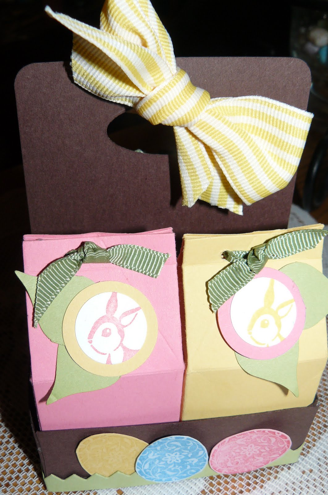 Anyway, the container holding the cartons is decorated with the Tasteful Trim XL die — I actually used the “negative” of this die — rather than using the rick-rack trim, I used the piece of paper remaining after removing the rick-rack. It was a bit larger and more “random” (Lyndsey, my daughter, thought that the scallop trim I originally used was “too predictable” and “lacking texture”!!) I stamped the Easter eggs in random pastel inks on pastel card stocks using the Easter Blossom Stamp set. The finishing touch … the luscious Daffodil Delight 1 1/4″ striped grosgrain ribbon. Love this ribbon which is probably why you haven’t seen a whole lot of it — I tend to “hoard”!!