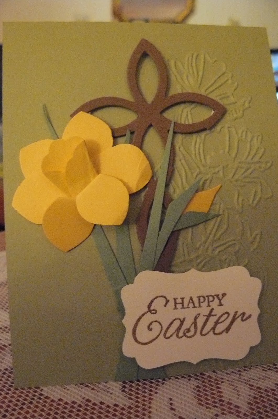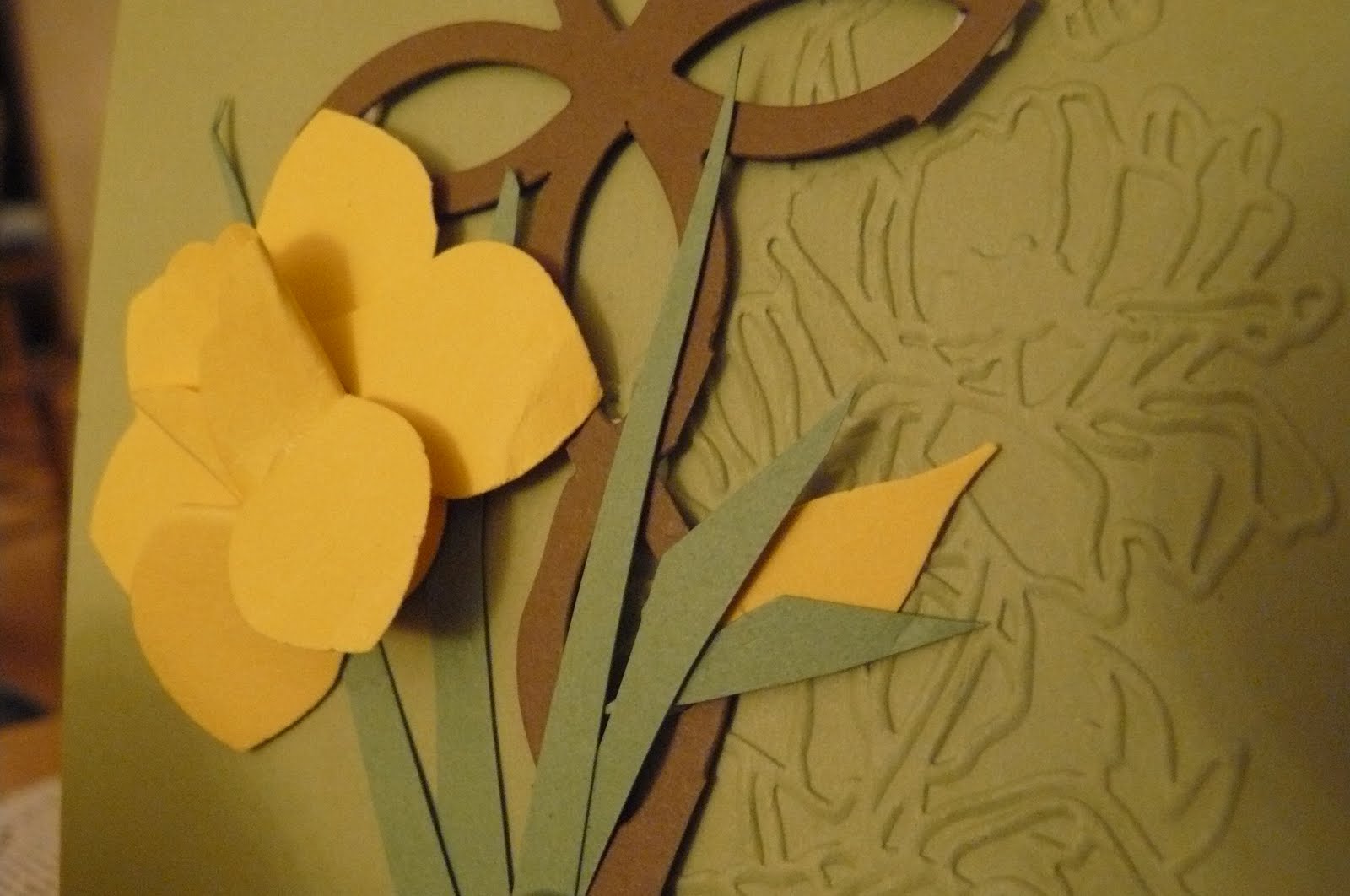 I also received part of my Summer Mini Catalog pre-order this week — I love the new Flower Garden textured embossing folder! (It’s pictured backwards in the mini catalog in case you’re really observant!). I used my Big Shot to emboss the image on some Pear Pizzazz card stock. The hard part was using my Big Blossoms punch to make the flower — can you tell it’s a daffodil? Chris figured that out, but thought my cross was a mis-shapen bunny!! Yikes … isn’t it obvious?! The Wild Wasabi leaves are just scraps that I randomly cut. My sentiment is also from the Easter Blossoms stamp set. I stamped in VersaMark and then embossed in gold — it’s punched using the Decorative Label punch.