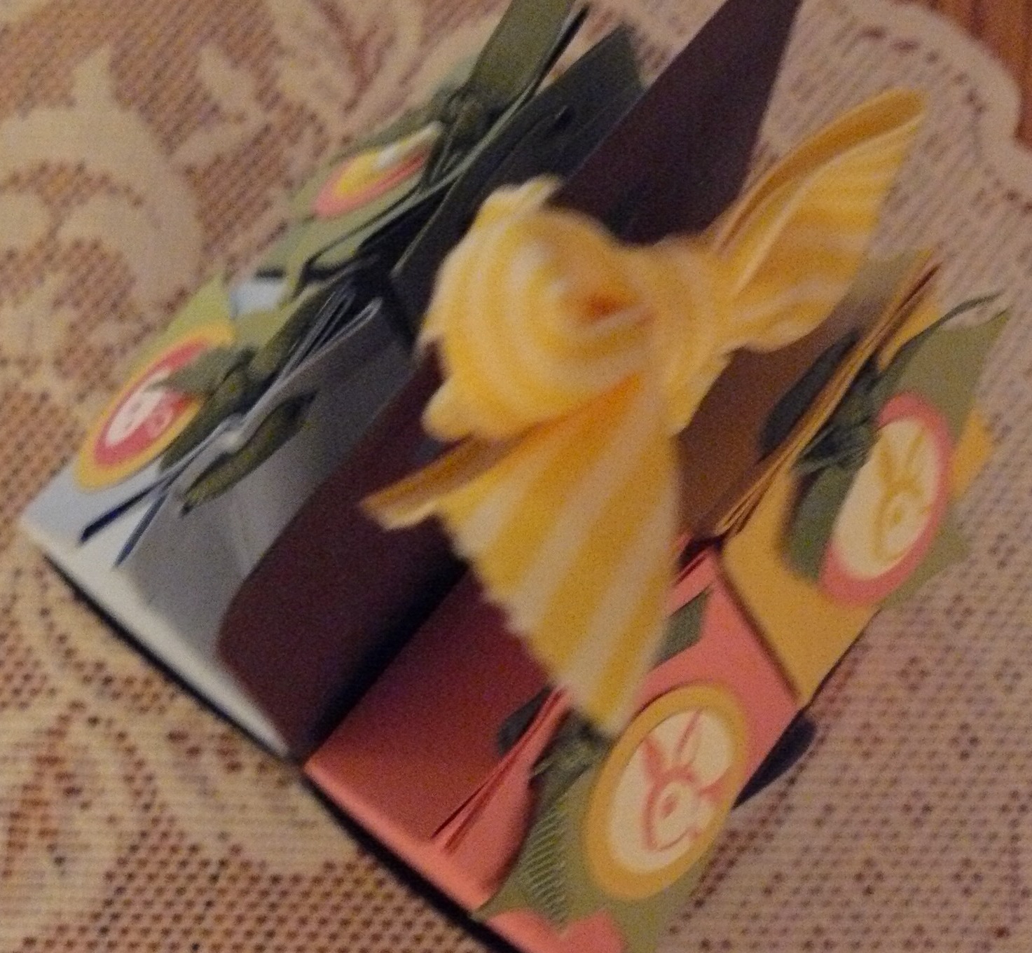 This is a container (I bought the tutorial from Inking Idaho last year!) that holds 4 of the mini milk cartons that use the Sizzix Milk Carton Die from Stampin’ Up. I filled each one (4 colors, 4 different Easter candy treats!) to the top with fun candy, and then decorated the cartons with my Forest Friends stamp set. I wanted to use the Accoutrements stamp set that was available last year (so cute!!) but since it’s retired, I didn’t want to entice anyone with something no longer available. The Forest Friends bunny is adorable, but he should have been punched with something larger than the 3/4″ punch I think — you’re missing the best part — his adorable tail!