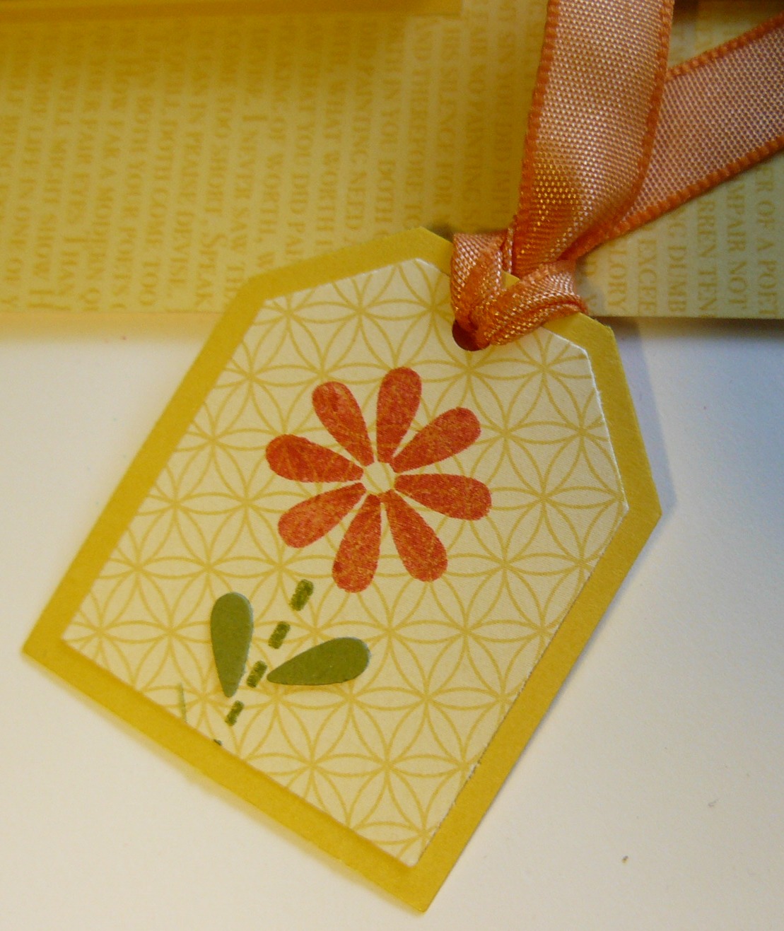 I made 4 tags to complete the ensemble. Sunny Garden DSP coordinates well with the Brights stack. I stamped just a part of the stem from Bold Blossom. The “leaves” are the remainder of the triple Bouquet Blossom punch when I punched out the smallest, most detailed flower in Old Olive — cute, huh?! Pumpkin Pie 3/8″ taffeta finishes the tag off nicely. You can see the tags peeking out of the right middle pocket in the very top photo.