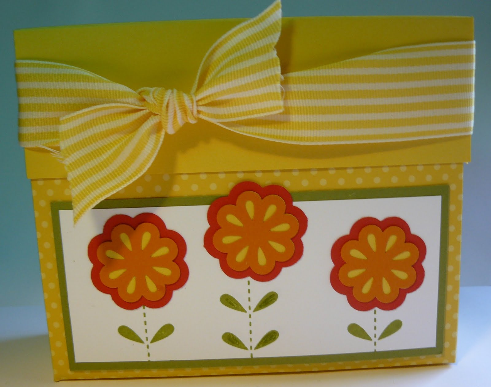 In the bottom photo above, you see the outside of my completed box. I punched the flowers, stamped the stems from “Bold Blossom” and matted on Old Olive card stock. This box is really neat! You just fold up the bottom and put the lid on to close the box! It stays put!