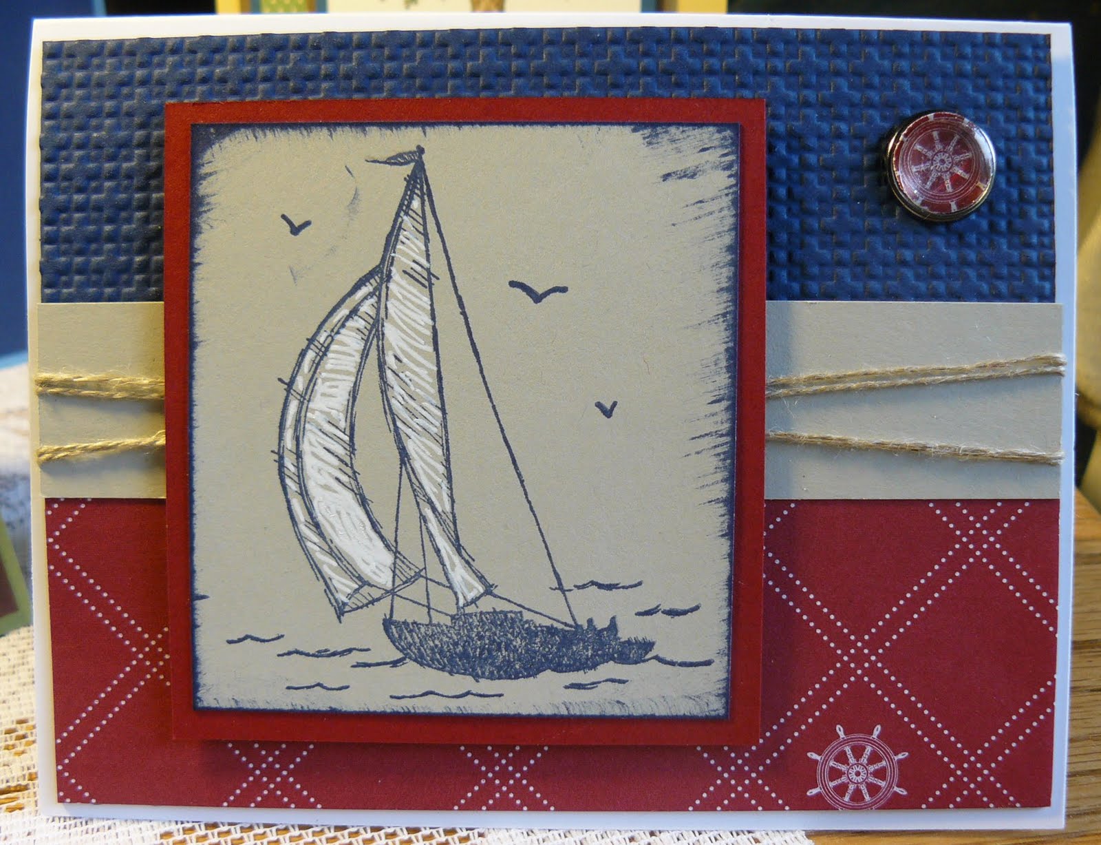 Two of the cards pictured above feature stamps or stamp sets from the current new Summer Mini Catalog. I love the “Sail Away” stamp that I used for the Cherry Cobbler/Night of Navy/Sahara Sand card on the right (also pictured singly below for more detail). I used a Signo Gel Pen to lightly color in my sails. The paper is the new Nautical Expedition DSP that is in this catalog as well (also available as a download with MDS). If I could have found the new Baker’s Twine that I ordered a few weeks back, I might have used that as my embellishment, but … I settled for a doubled-up linen thread instead. I’ll probably find that twine as soon as I post this! LOL! I decided to use one of my Build-a-Brads embellishments on this card too — I punched out a small ship wheel from an extra piece of the Cherry Cobbler DSP from the Nautical Expedition paper pack and adhered that to the Build-a-brad. I love this little detail! The Night of Navy layer is embossed using the Big Shot and the Square Lattice folder too.