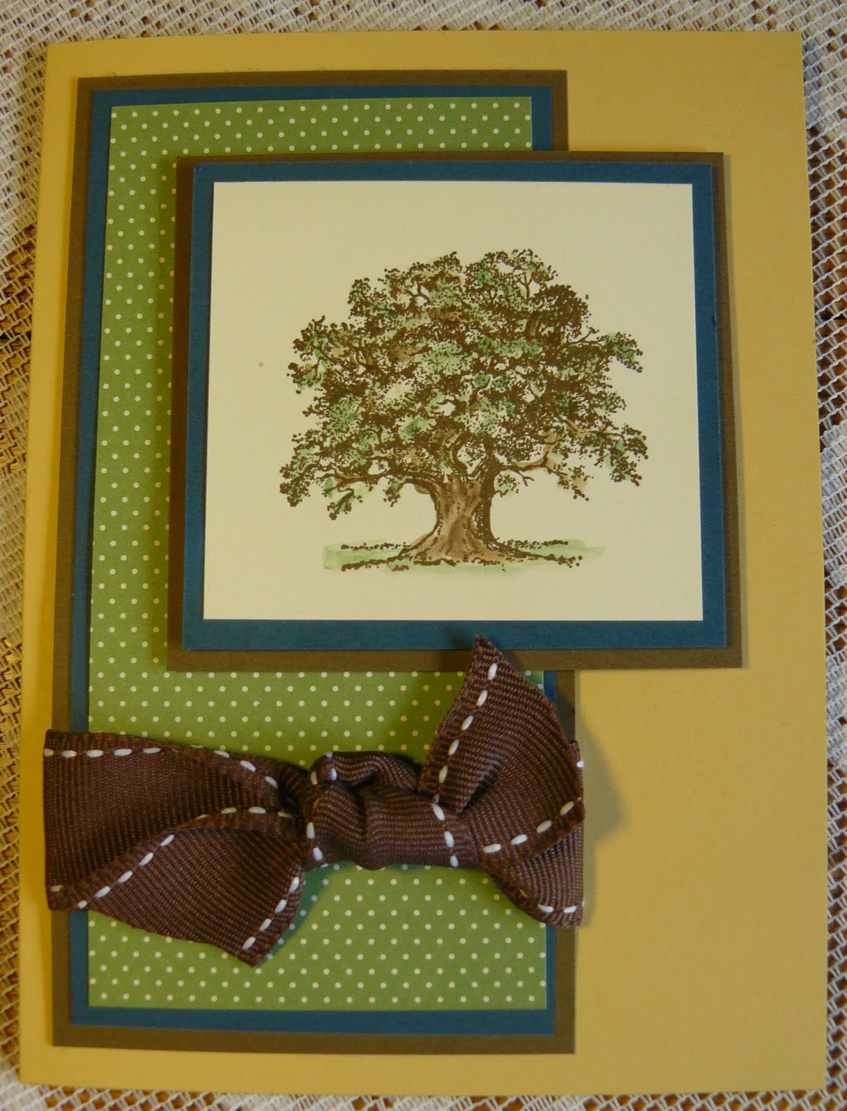 I was stuck on this next card (pictured below) a bit. I stamped and colored my tree with the blender pen and my Wild Wasabi/Soft Suede ink, and then couldn’t decide on a sketch to use. The image almost took up too much of my standard-sized, 4 1/4″ x 5 1/2″ card, so I finally decided to mount it on a larger So Saffron card base. The measurements for this one is 9 1/4″ x 6 1/4″, scored at 4 5/8″. I then added another mat using a second piece of paper from the Woodland Walk DSP. The wide chocolate chip stitched ribbon was a good finishing touch, since I couldn’t decide on a sentiment for the outside of the card. This way my customers can choose the occasion for the card if they opt not to use it for Father’s Day this weekend.