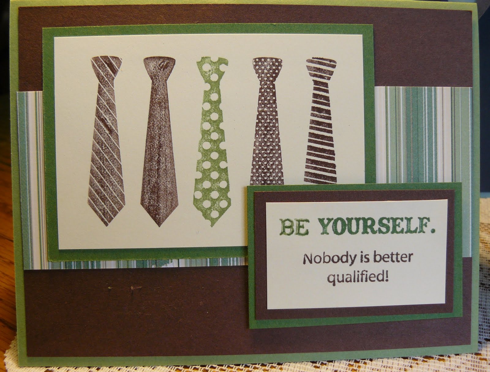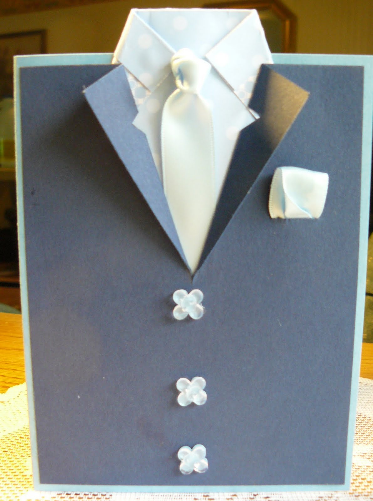 Jackie Topa. It’s a fun shirt card and wasn’t that difficult to make! I love navy suits, so I made my card Bashful Blue and Night of Navy — the DSP is retired but still left over in my stash. Since I’m also a sucker for polka dots and/or stripes, my “shirt” is a Bashful Blue DSP. I used some Bashful Blue Satin Ribbon (I can’t remember … is that retiring?!) for the “handkerchief” and the “tie”. All I can say is that it’s a good thing that I’m not a guy, ’cause I can’t tie a tie for nothin’!! I think tie-tying might be a gift! Now that I think about it, not all guys can tie one either! LOL! This tie, however, was extremely easy following Jackie Topa’s directions!