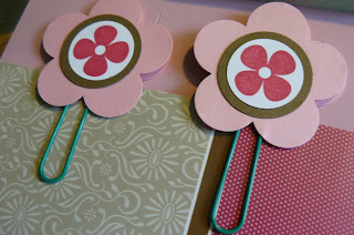 The book marks are made with another flower from the Printed Petals stamp set. I stamped them in Rose Red and used my 1 1/4″ circle punch to punch them out. I then punched out a soft suede 1 3/8″ circle, and layered it on top of the Flower Punch. I used a couple of layers of dimensionals to pop them up on the paper clip. Voila! You have a bookmark that took minutes to create!