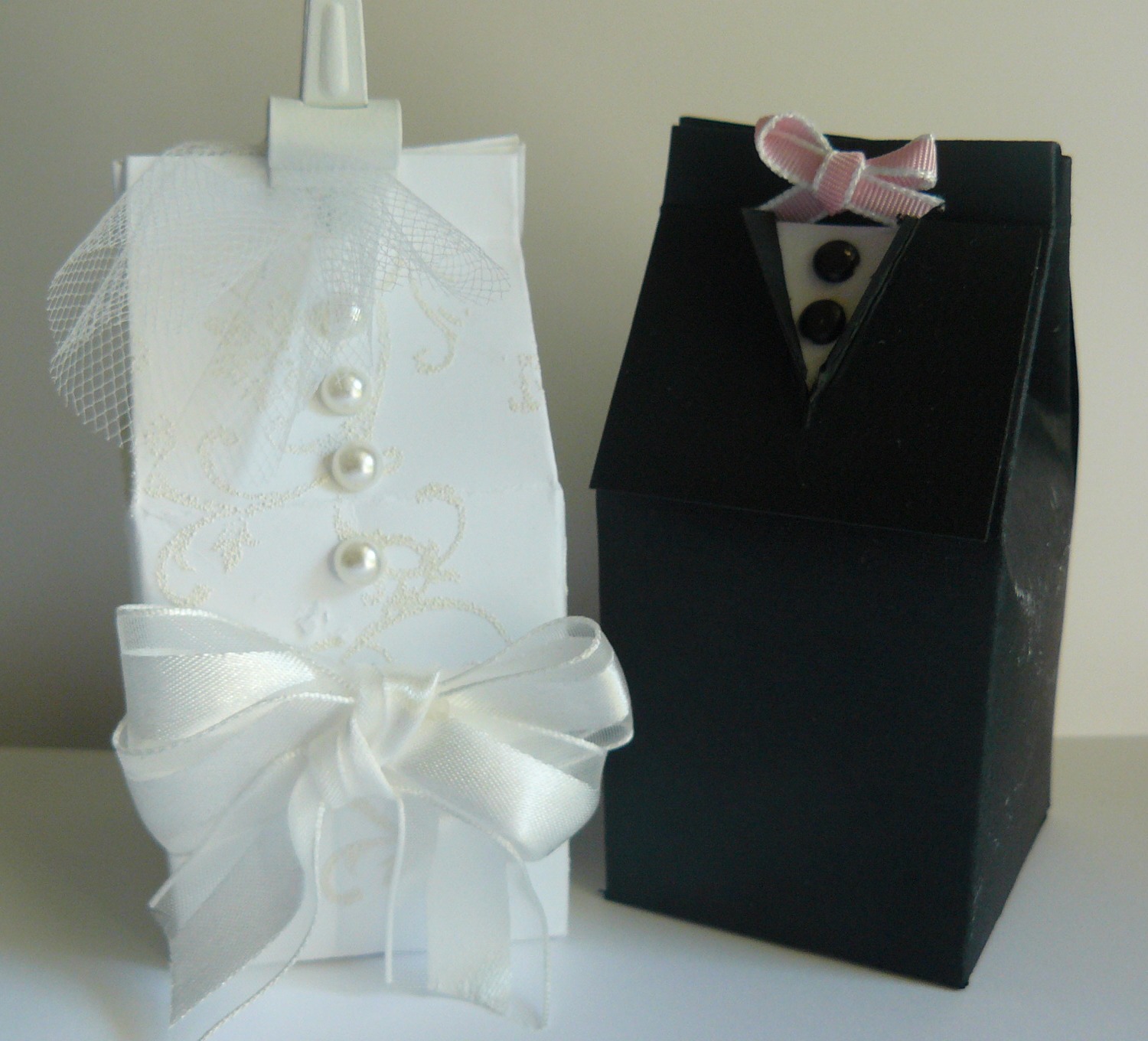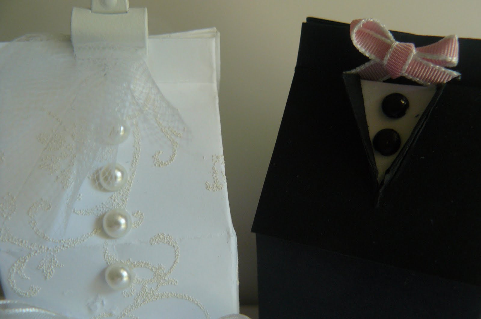 The groom’s box was a bit easier: I just cut an underlying piece of white cardstock for the front of the box, then overlayed a piece of black cardstock that I cut half-way down and folded back for the jacket lapels. This part was easy because I remembered how I did my shirt card a few posts back seen here. I decided that the pink 1/8″ taffeta ribbon would be a nice touch as it matches the favor box that I made.