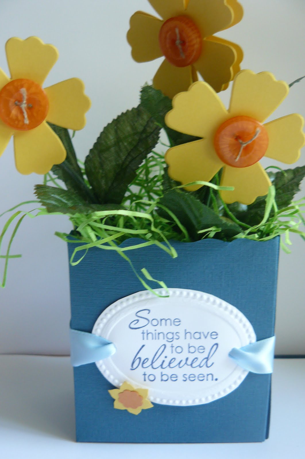 2. Another Fancy Favor Box! I used some Not Quite Navy 12×12 paper to cut out this box, and I cut some flowers using the Fun Flowers die to cut out some Daffodil Delight flowers. The centers are the large buttons from the Brights Buttons collection. I tied some linen thread through the centers to attach them to the flowers. Cute, huh?! The sentiment is framed using the new Designer Frames Embossing Folder. I love it! The mini flower is punched with the Boho Blossom punch, and the ribbon is the “new” Bashful Blue Satin Ribbon (new to the big catalog, but carried over from the spring Mini Catalog! Love it!).