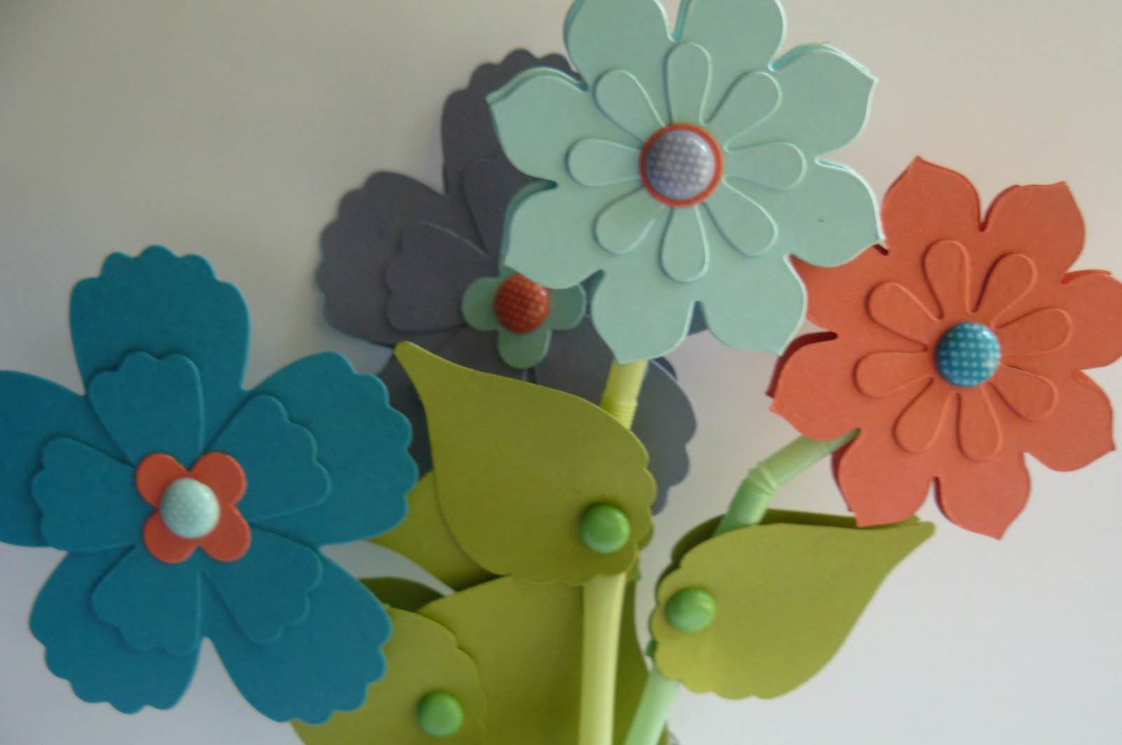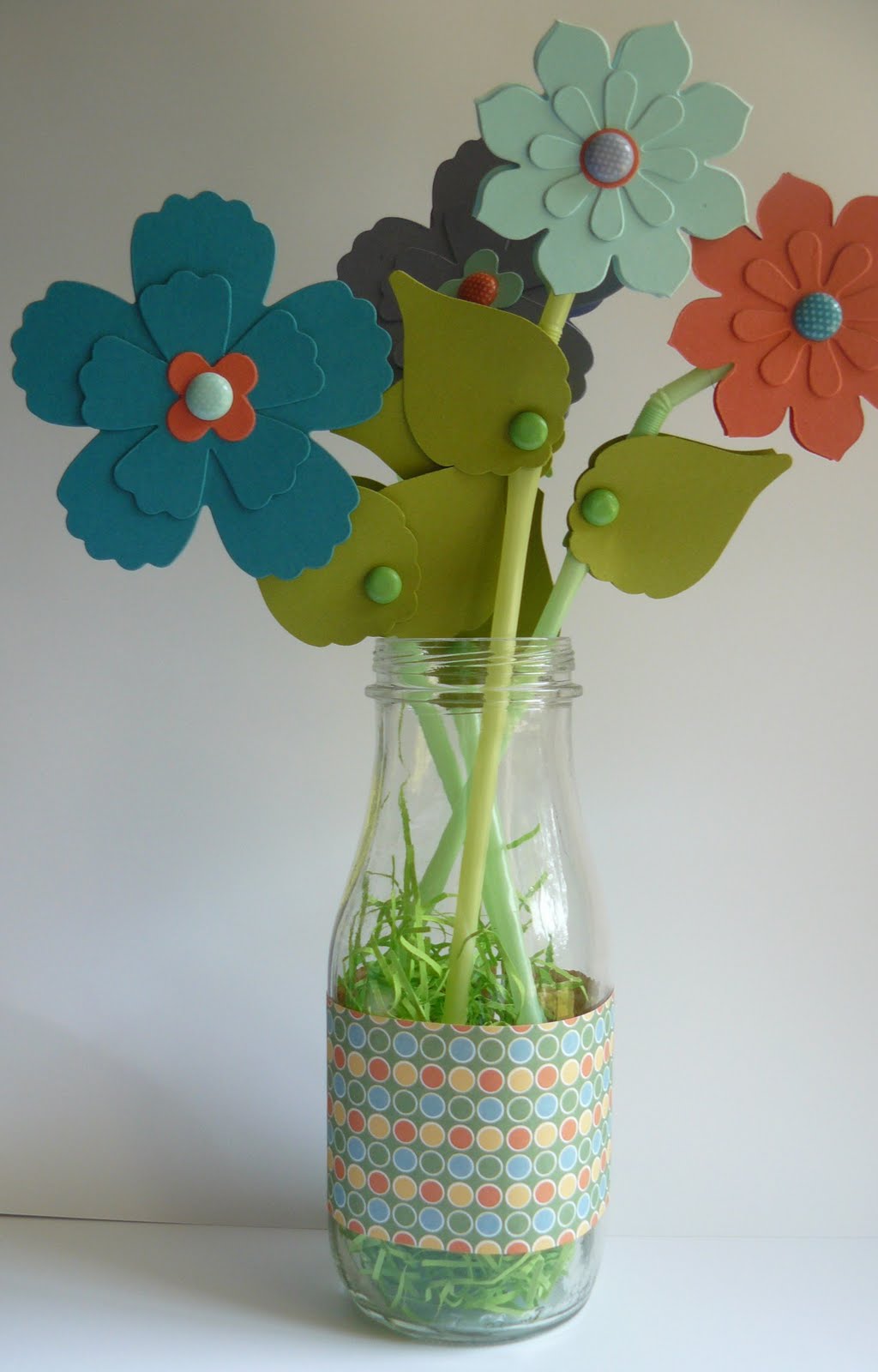 3. This is a “recycled” frappucino bottle that I covered with a strip of the Just Add Cake DSP. The flowers are cut from various sizes of the Fun Flowers and the Blossom Party dies. I used these flowers to showcase the new In Colors: 4 colored flowers, plus the leaves are cut from the Lucky Limeade paper to make number 5! I wouldn’t say cute … but definitely effective!