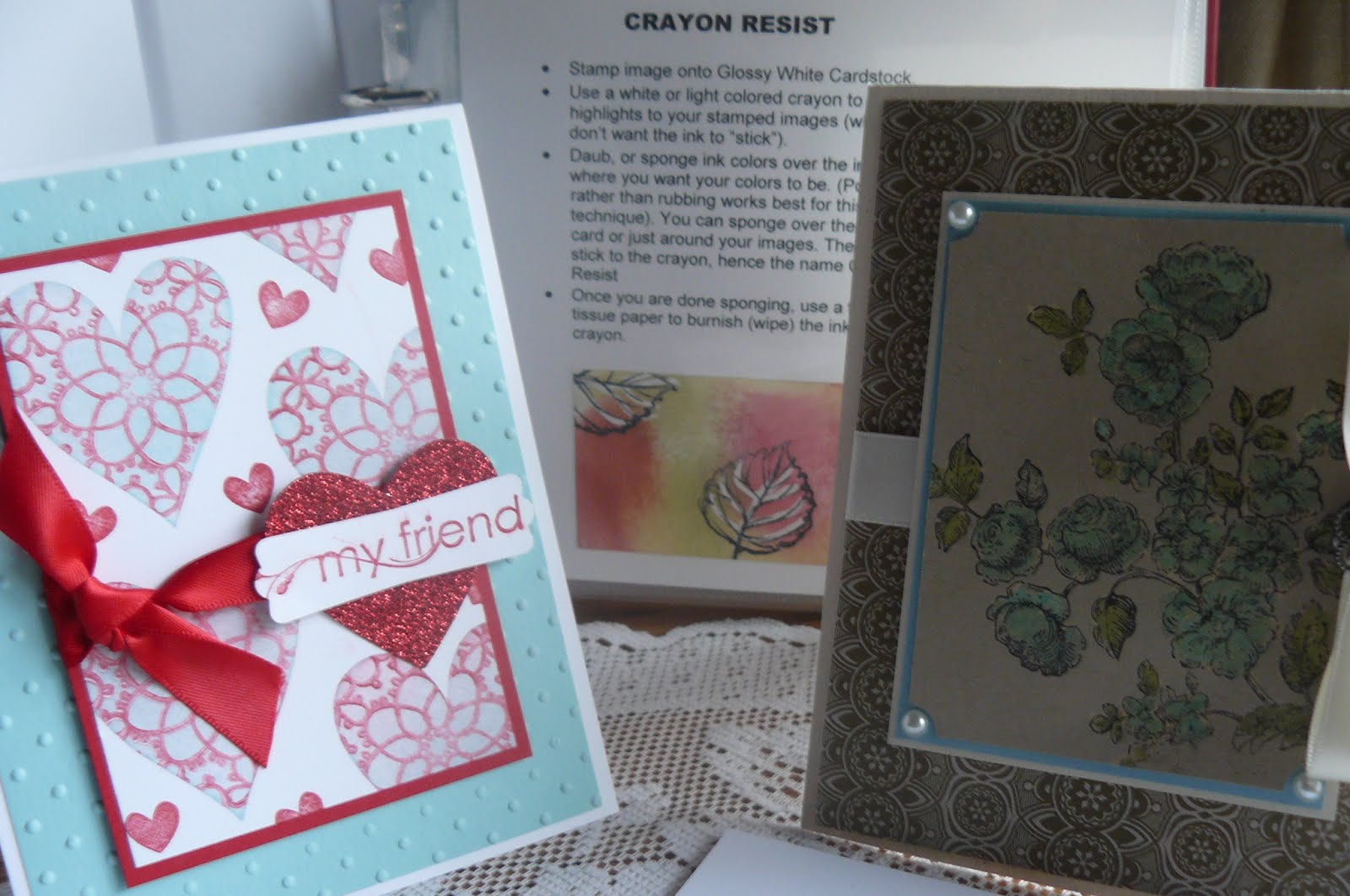 We did two techniques last night — bleaching and kissing! Perfect for Valentine’s Day! I just love the card on the left — great colors — case’d but changed from somebody on Stampin’ Connection I think!