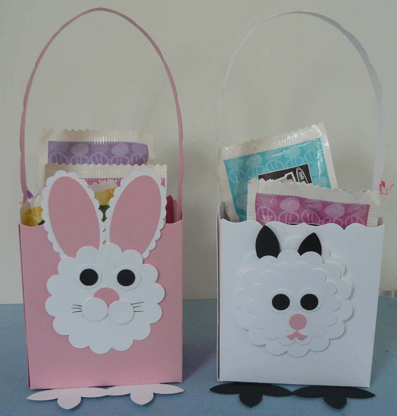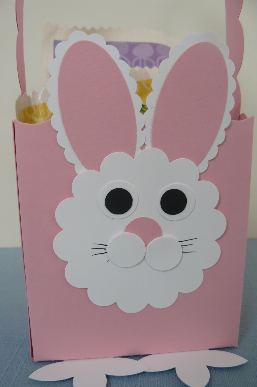 I was confused as to how Susan made the cute little mouth on Lulu — if you can picture it, she used a scrap of the pink that she had just punched out with a scallop round punch, then trimmed it into the cute little pucker! We tried to add eyelashes, like Darla sported, but unfortunately, she (Lulu) looked slightly possessed! Not appropriate for this adorable pal!! The handles on each basket are from the Tasteful Trim die.
