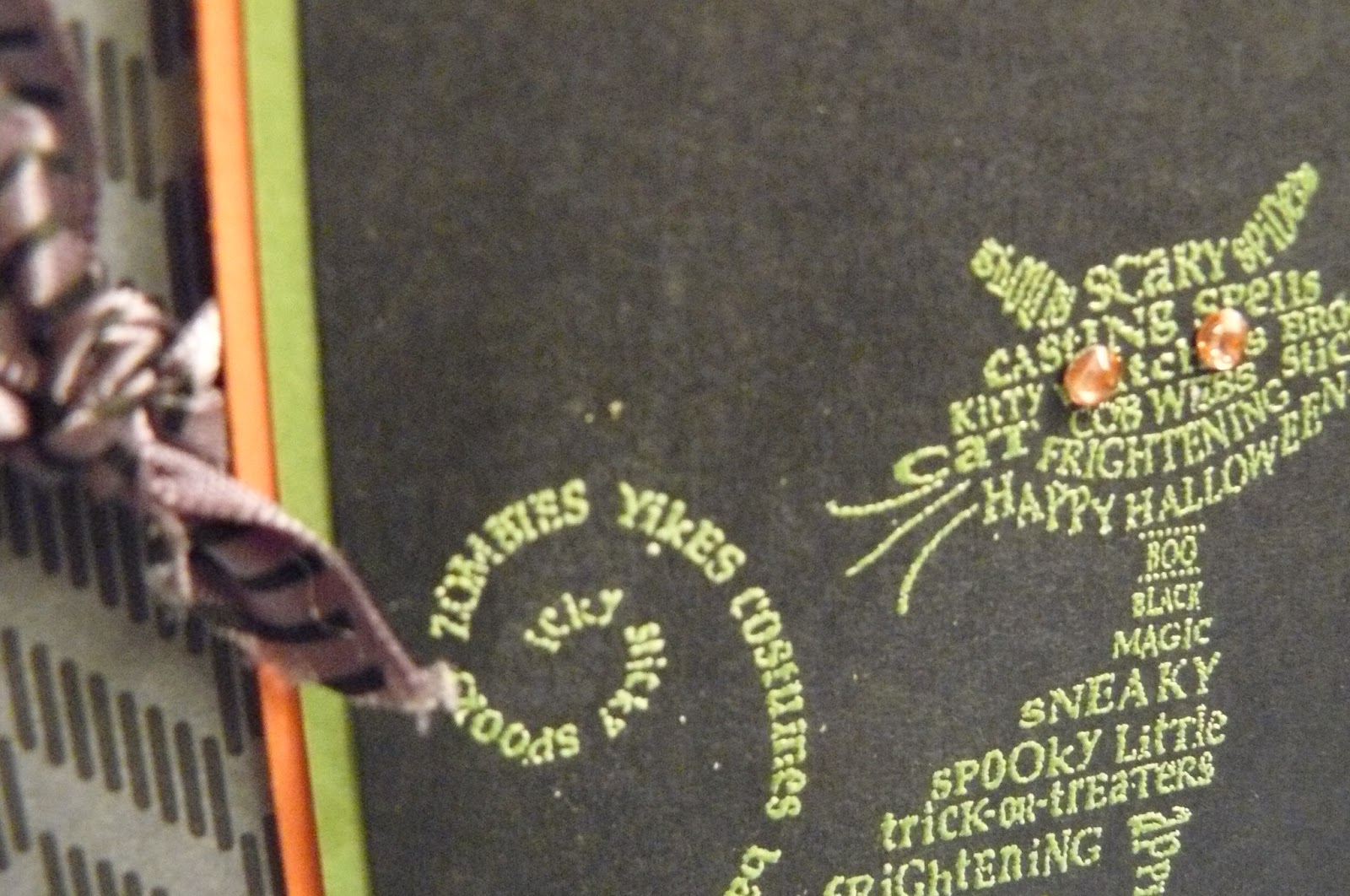 Accessories: Rhinestone Jewels, 1/2″ Striped Satin Ribbon 127837) , Heat Tool, Gumball Green Embossing Powder (128981), VersaMark ink. (non-SU orange sharpie marker).