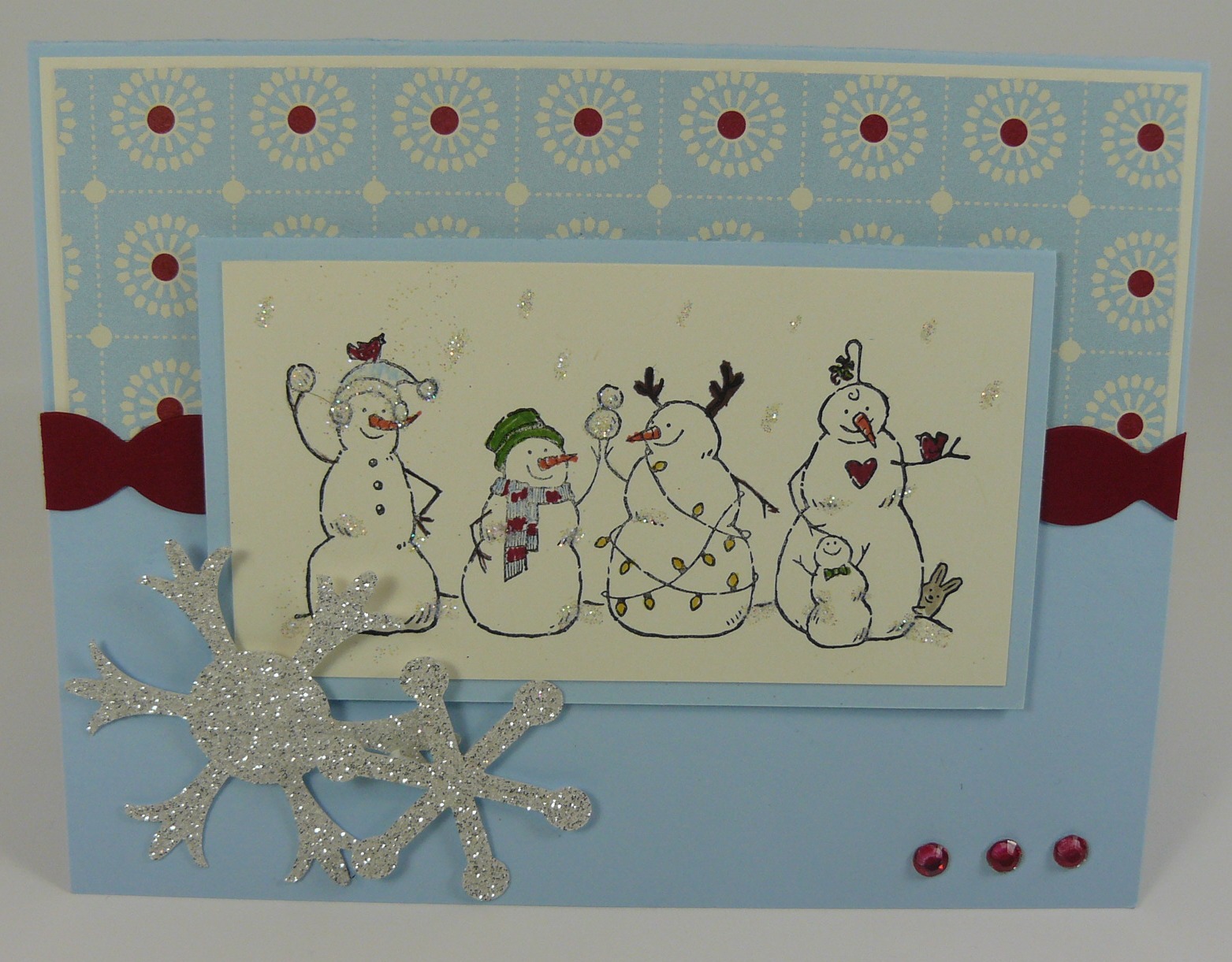 I met with my upline yesterday and she encouraged us to participate in Mary Jo’s Sketch Challenge. The challenge was even greater because we (my upline and 3 other demonstrators besides me!) all had to use the Frosty Friends stamp and choose a patterned piece of paper (preferably different but that didn’t end up being a requirement as Marilyn and I both chose the same one unknowingly!) from the Festival of Prints pack.