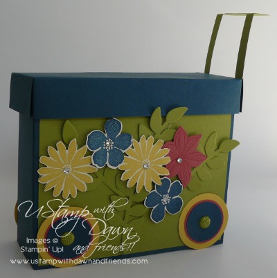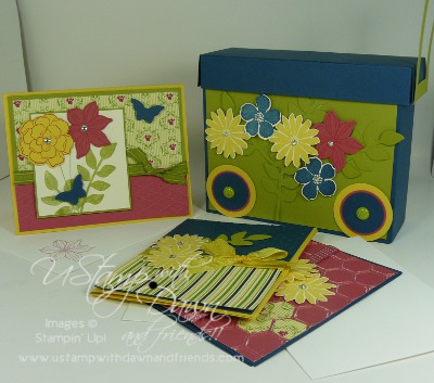 I chose to make a box of cards that looks like a Garden Cart. I used the Secret Garden stamp set with the matching framelits. The box holds 6 cards — each one is different.