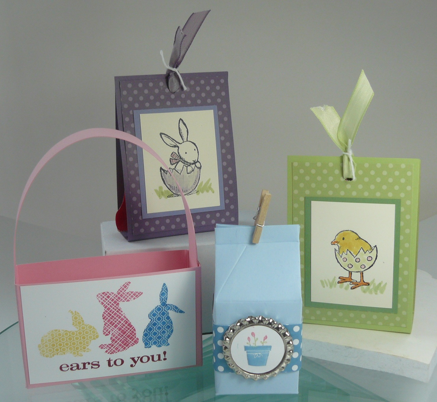 The little matchbook treats hold an M&M or Skittles treat pack — I stamped the images from Everybunny and colored them in with markers and my blender pen. Again, the instructions came from Angie Juda’s site if you want to duplicate these!