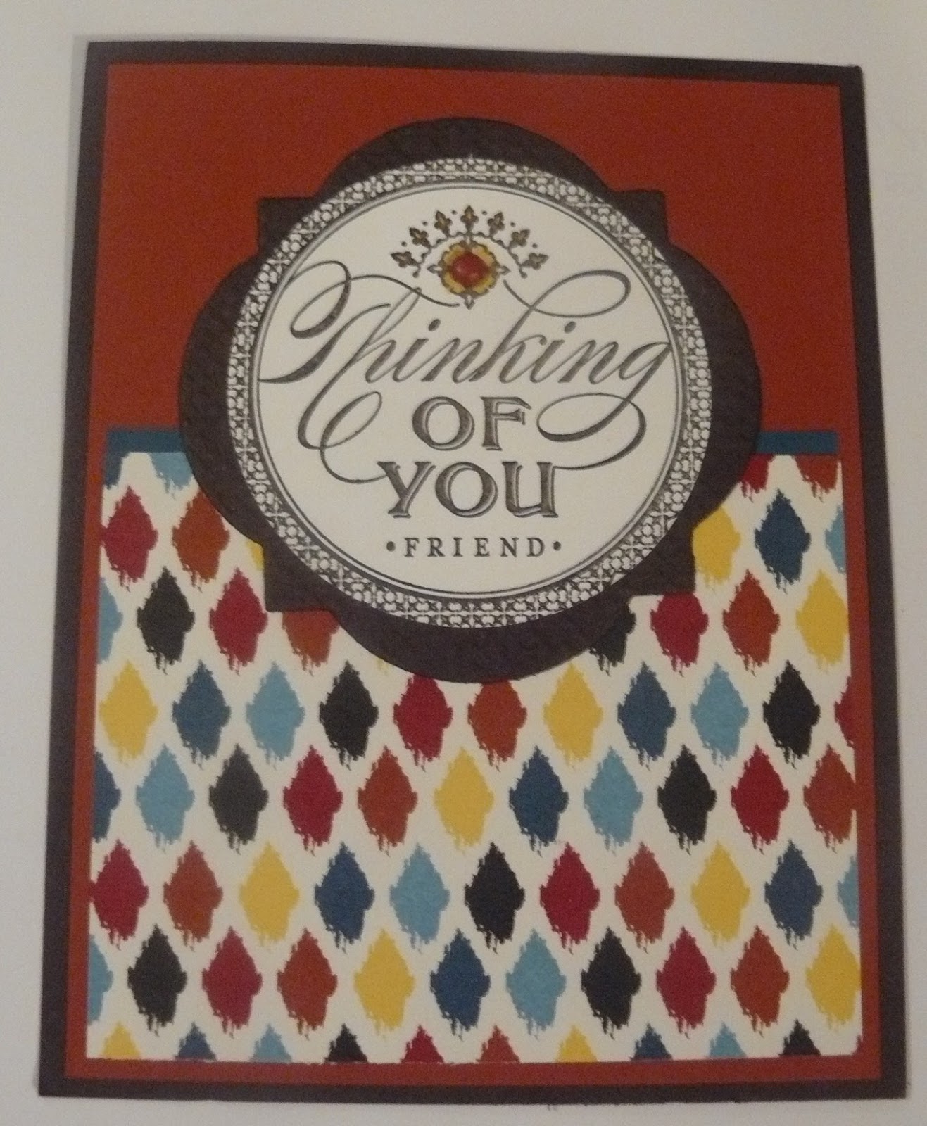 There’s a tiny brad in the center of the design at the top of the stamp — IT’S GOING!! Get your brads in all of the color family soon! I’m not sure what I’ll do without these brads. Love ’em! The DSP is perfect for dad or grad — Parker’s Patterns. Yep, in the spring mini and leavin’ shortly!!