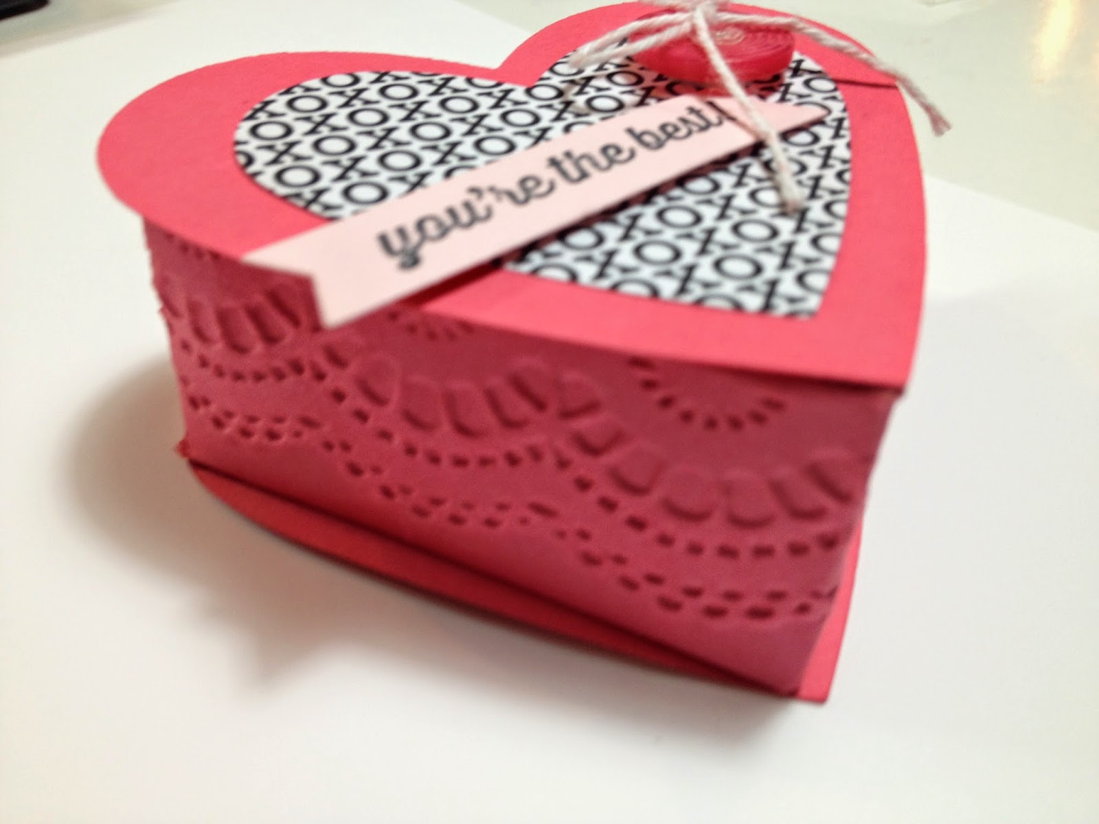 The heart-shaped box is adapted from a tutorial from QBee — you can see the tutorial here — I changed the paper and the embossing folder to the Delicate Details TIEF since the heart folder is retired (although it would have been perfect!). When you emboss the middle strip, you can’t even tell that one half is negative embossed (because I had to flip the folder!), and the other is opposite!!