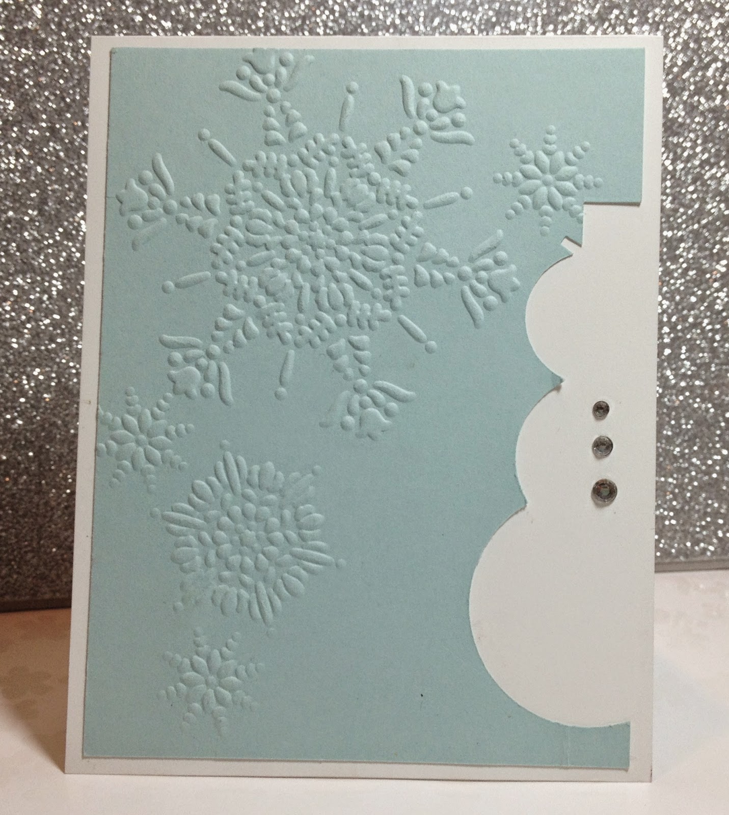 To make your card, start by embossing the Soft Sky c/s with the Northern Flurry embossing folder (TIEF). Once you’ve don that, use a variety of round and shaped punches — start from the bottom with the largest Circle punch (1 3/4″), and overlap/gradually work your way up. The hat is the 1″ square punch. Once you’ve punched the square out, you can add a brim by tilting your bird punch leaf stem just right. My advice to you is to make yourself a template once you’ve got your snowman shaped the way you want him! The buttons are the Basic Jewel Rhinestones — attach the Soft Sky layer to a Whisper White card base and attach the rhinestones to the Whisper White base.