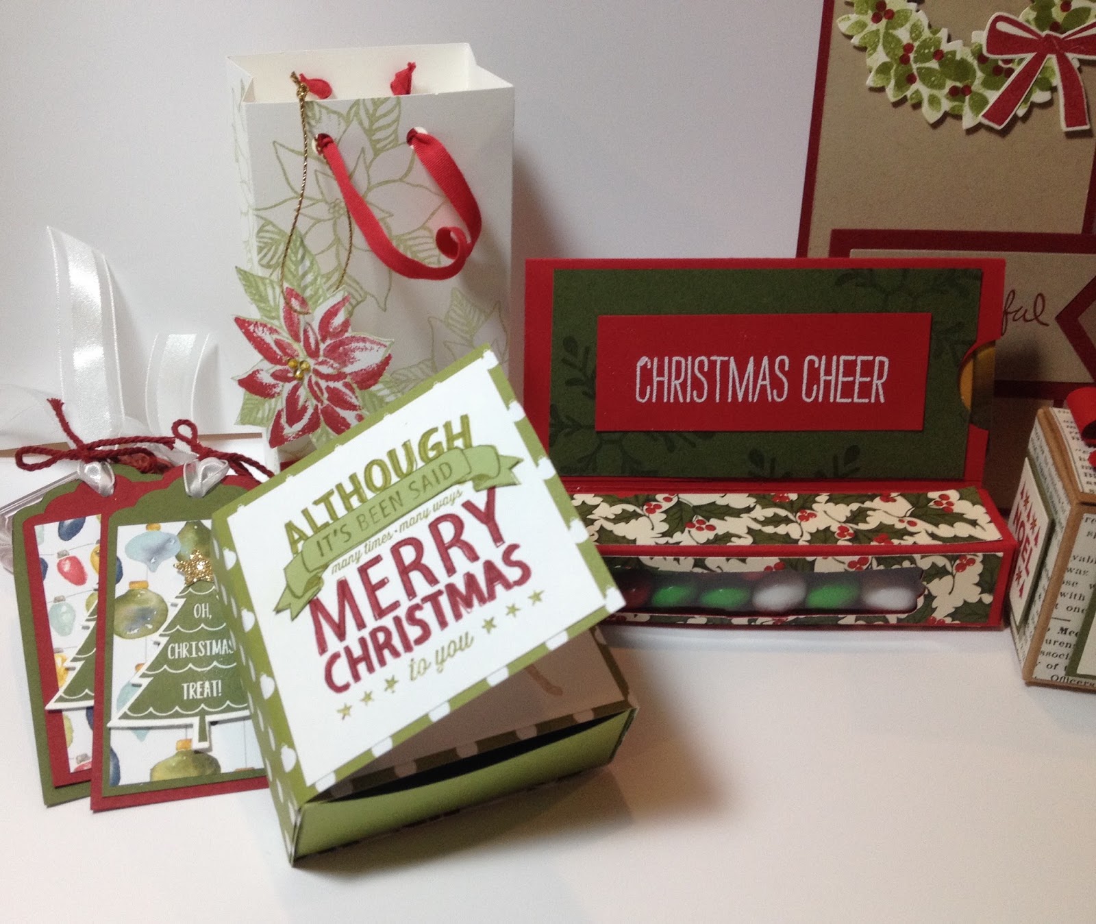 All of these projects are quite simple to make, but take a bit of time to prepare. Everyone will love the thoughtful gifts though! The 3×3 box is a card with a concealed box! Hide some chocolate in there! The Mini Treat Box is the perfect size to stow some Peppermint Patties! Attach the bottle tag to a special bottle of wine, vinegar, or gourmet oil. What a clever way to give a gift card — attached to more chocolate in the long treat box! The gift bag made with the gift bag punch board can hold anything — soaps, cookies, candies, an ornament, or anyting little that needs special presentation!