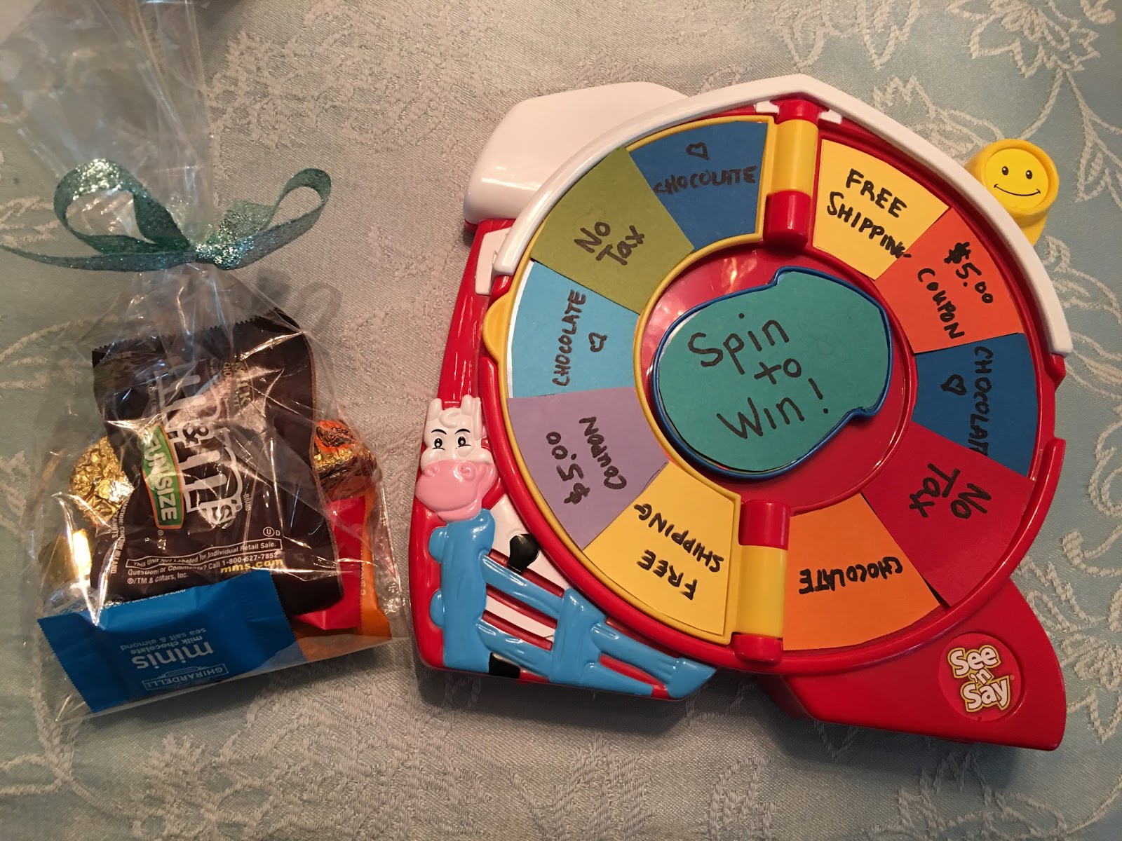 And the giveaway wasn’t over till the very last spin! Ladies could win “free shipping” (people hit that button a lot!), no tax ( I paid it!), a $5.00 off coupon, or chocolate! That’s a chocolate goody bag there … loaded!