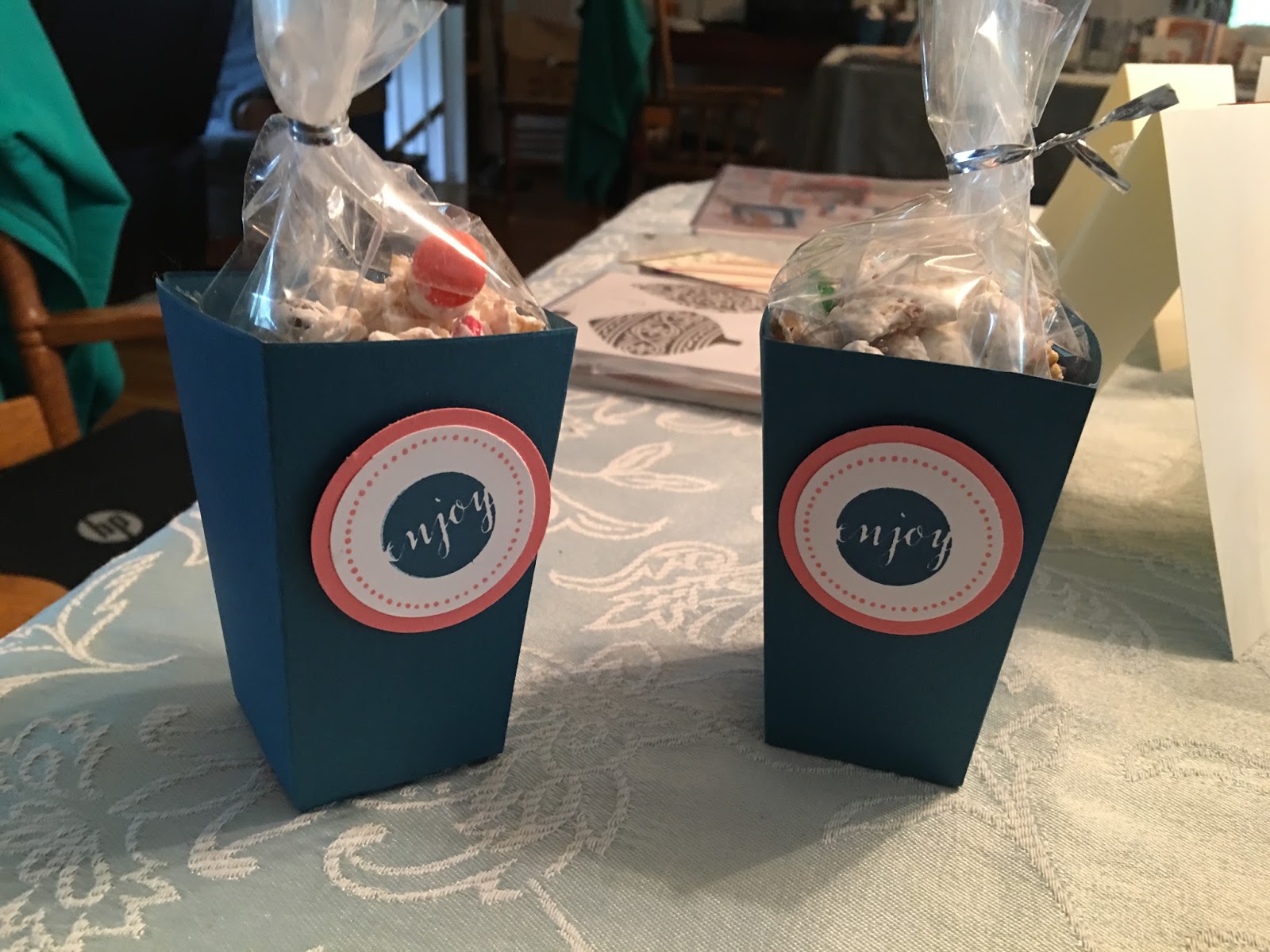 I made these cute popcorn box favors for everyone, using the new Popcorn Box framelit and mixing up a couple of batches of my favorite White Trash recipe. Yum!!