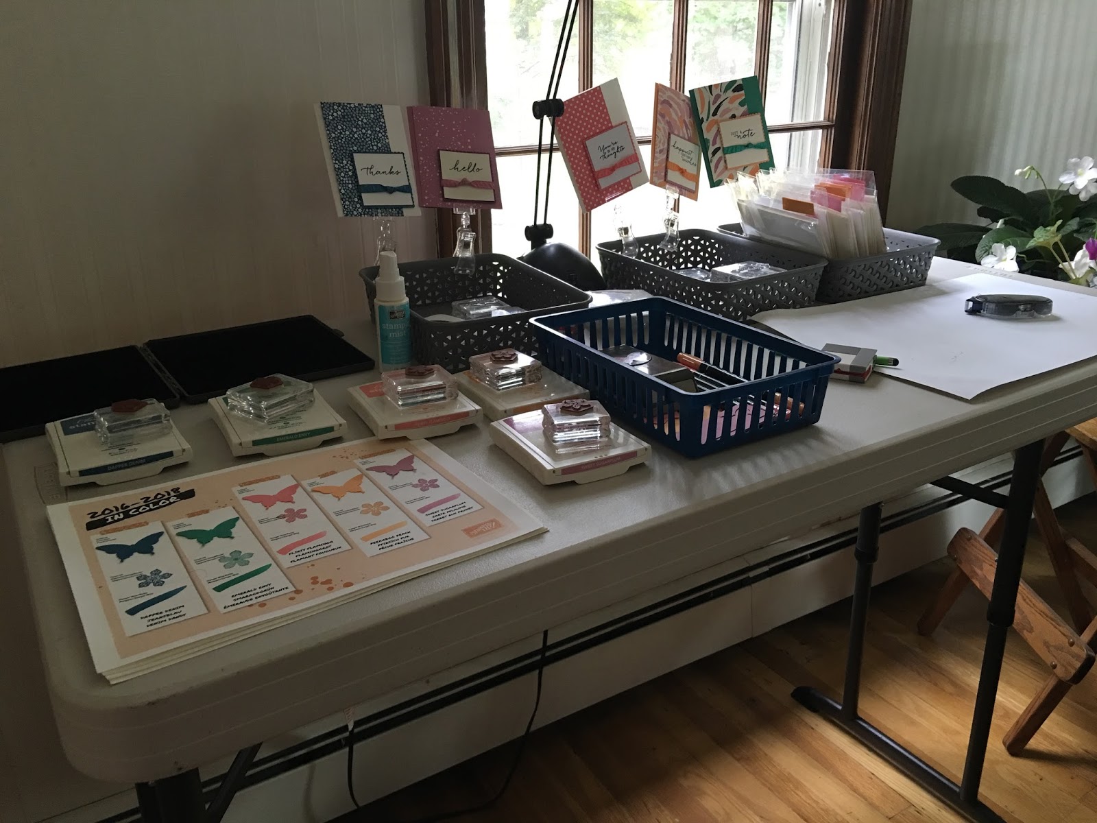 This is a glimpse of my BOGO table: I sell everything for the price that it retailed for originally when I bought it. After “purchasing” the stamp sets etc., the ladies would choose the equivalent amount from the new catalog, paying tax and shipping. It was like getting the retired stuff for free!
