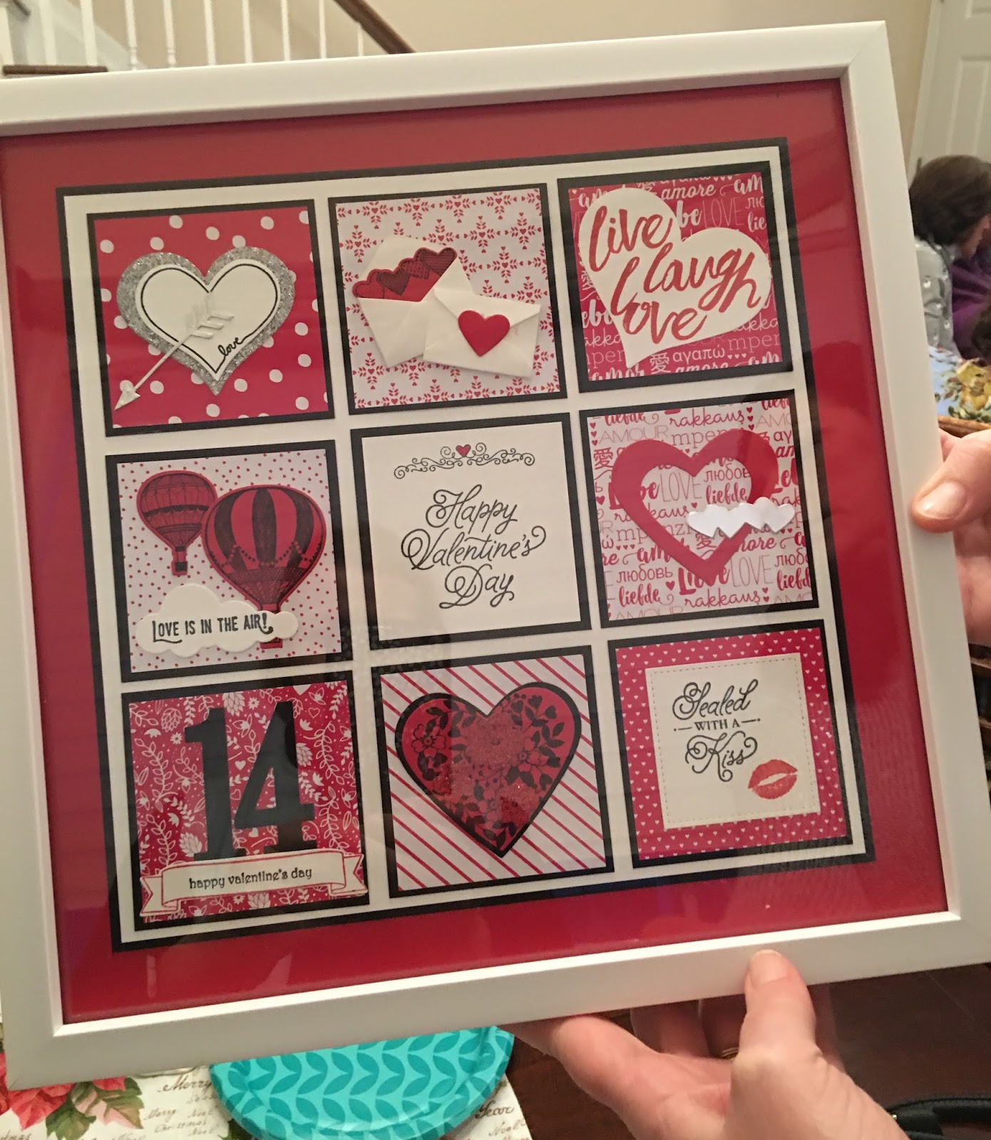 It was our annual Stampin’ Up! demonstrator team party this past Sunday.  We always get together for fun and a 3D Yankee swap.  I was strapped for time and ideas, so I made a wall sampler using several current “love” stamp sets and framelits.