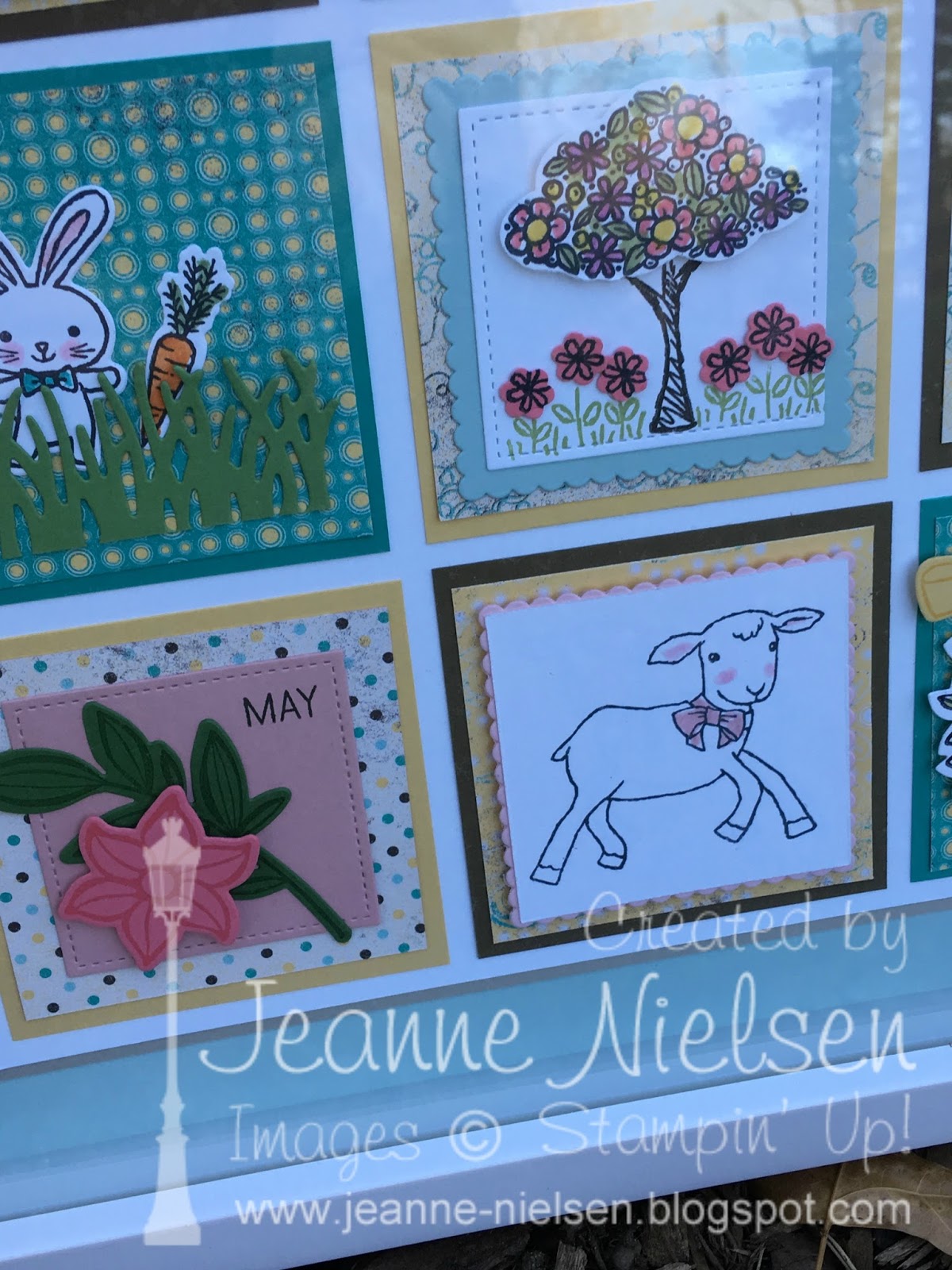 The bottom left and center squares are more favorites… indeed! Again, I used the Project Life Date It stamp set to stamp May. Get it??! April showers brings May flowers! LOL! The flower is again stamped in my favorite incolor ink, Flirty Flamingo on Flirty Flamingo c/s. The leaves are Garden Green ink on Garden Green c/s. The stamp set used is Falling Flowers, with it’s matching May Flowers framelits. The little lamb is another “little cutie” from the Little Cuties stamp set! Isn’t he adorable with his blushing pink cheeks?! I colored the ears and bow in with Blushing Bride marker, then blushed his cheeks with Pink Pirouette marker. (Oops, I did the same with the bunny in the square above — the bunny’s bow is Bermuda Bay … say that 5x fast!).