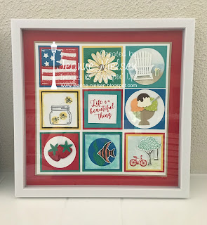 I used only current stamp sets — I think you can click on the picture to enlarge it. Check out my supply list below for the list of stamp sets (If I used both stamp sets and punches or framelits, I will list the bundle only.) The frame was a 12″ x 12″ scrapbook frame that I purchased with a coupon from Michaels. I’ve been able to find this particular frame in both black and white.