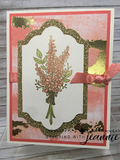 I have to say, I LOVE this stamp set called Lovely Lavender. This particular card is filled with lots of glitter and shine!! It doesn’t show in the photo, but I gold-embossed the image and then stamped over with the colored ink pads. The technique is called two-step stamping. No, the images don’t line up perfectly, but that’s part of the watercolor-look charm!!