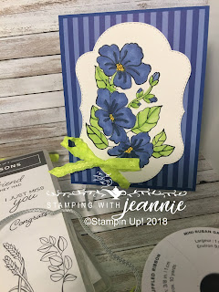 The image is stamped on Shimmer White cardstock and cut out with the largest framelit from the bundle. I then colored the flowers with Night of Navy blends, primarily the light, accented with the dark marker. The leaves are colored with the new Granny Apple Green blends, and my centers are colored in the Daffodil Delight blends … light I believe? The final accent is a small length of Lemon Lime Twist ruffled ribbon, tied in a simple bow and attached with a glue dot.