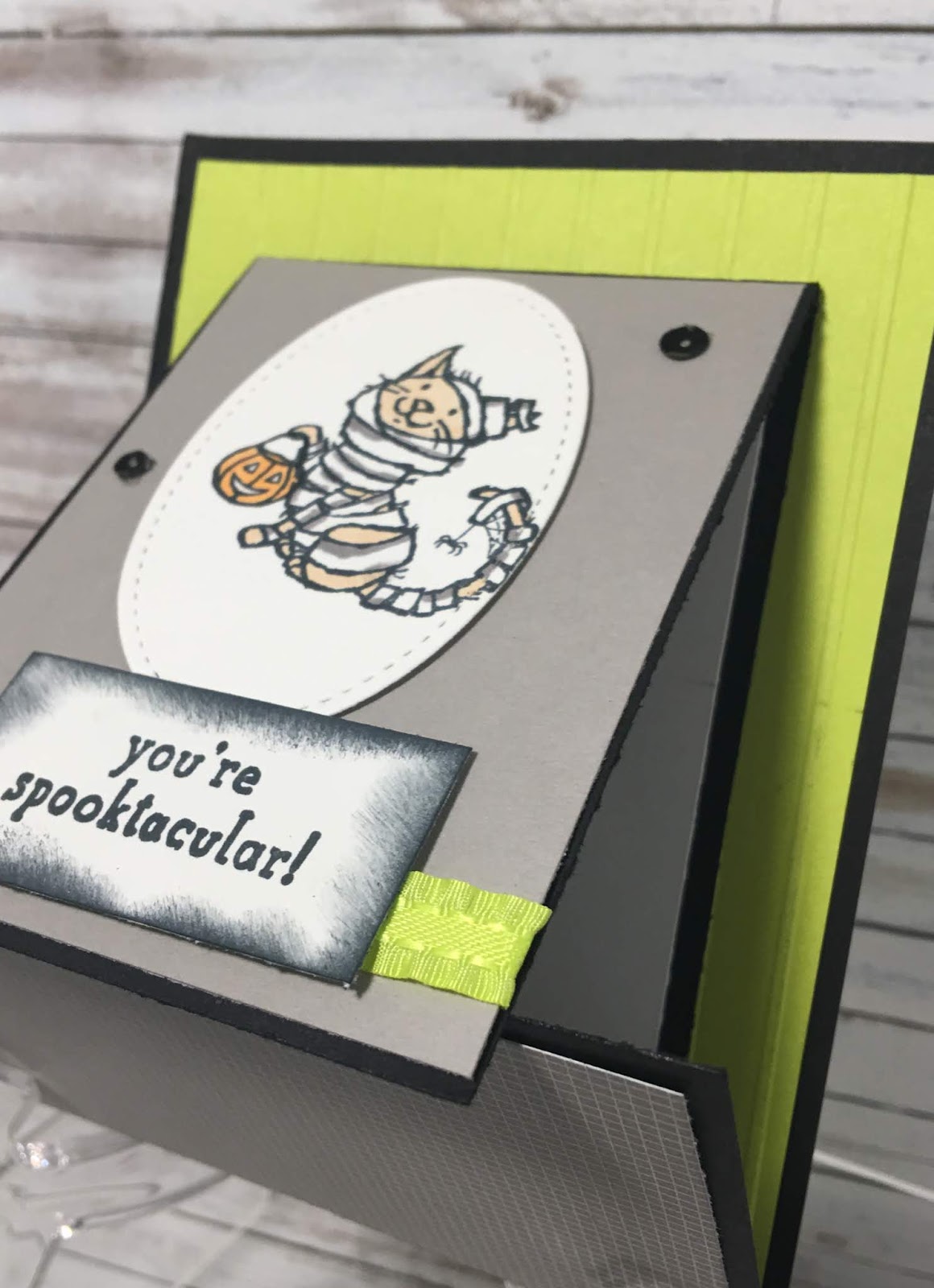 - Whisper White Stitched Oval(I think the 2nd largest), cut with Big Shot, stamped with cat from Trick or Tweet stamp set and colored in with markers or blends