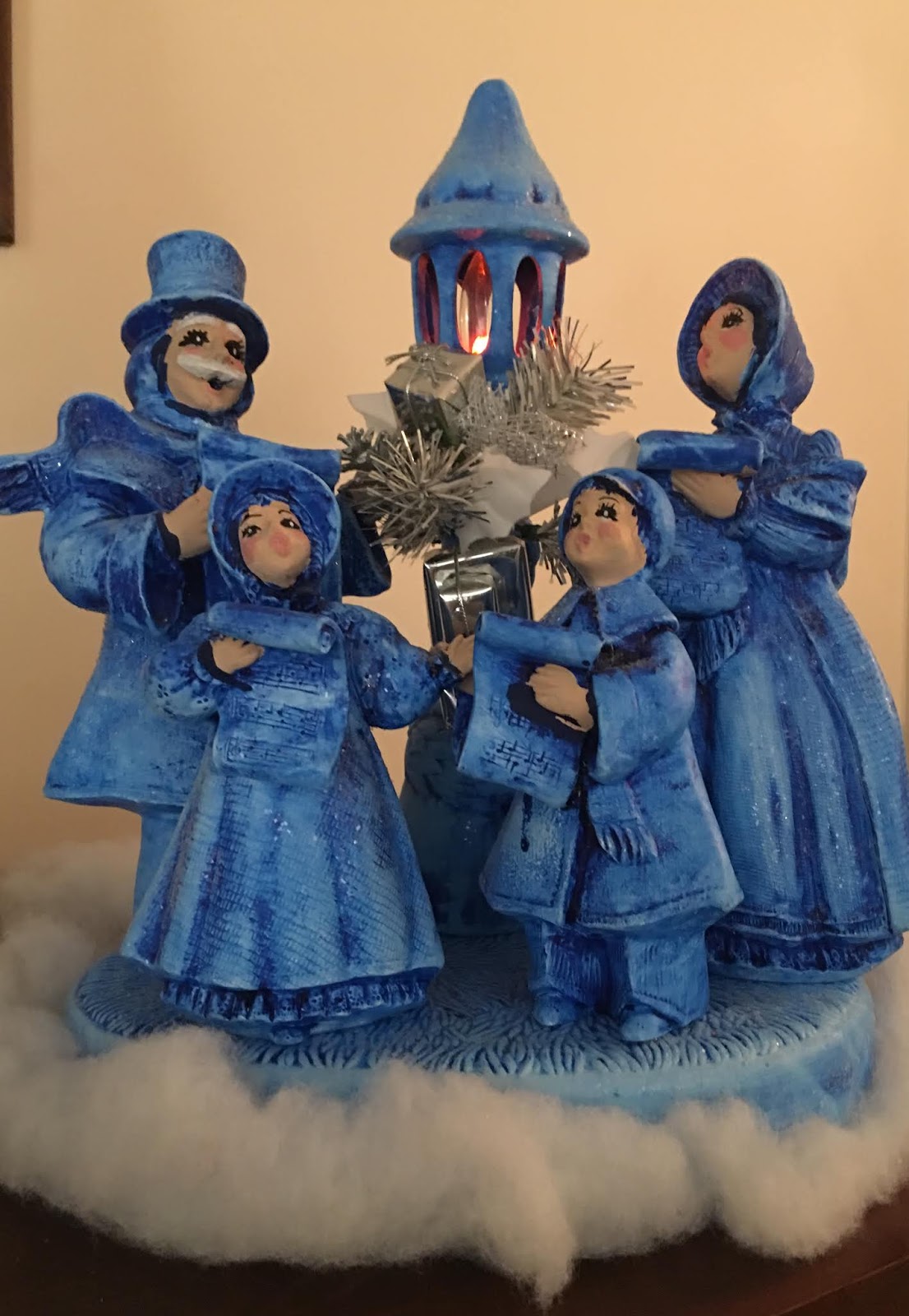 We all too soon have to set out on our 5-hour ride through the middle of nowhere to reach my parents — usually through snow, rain, fog, deer sightings, etc.  At my parents, I’ve come to expect the small Christmas ornament that “sings” when you turn on the Christmas tree lights connected to the main light switch (it’s the first switch I turn on and off when I reach my parents – drives my dad batty!). Then, of course there are the “Blue People” —  I love to comment on this Victorian-era group of carolers (all with frostbite!) as they sing their hearts out for all to hear (check out the photo below — you’ll understand what I mean!).