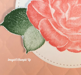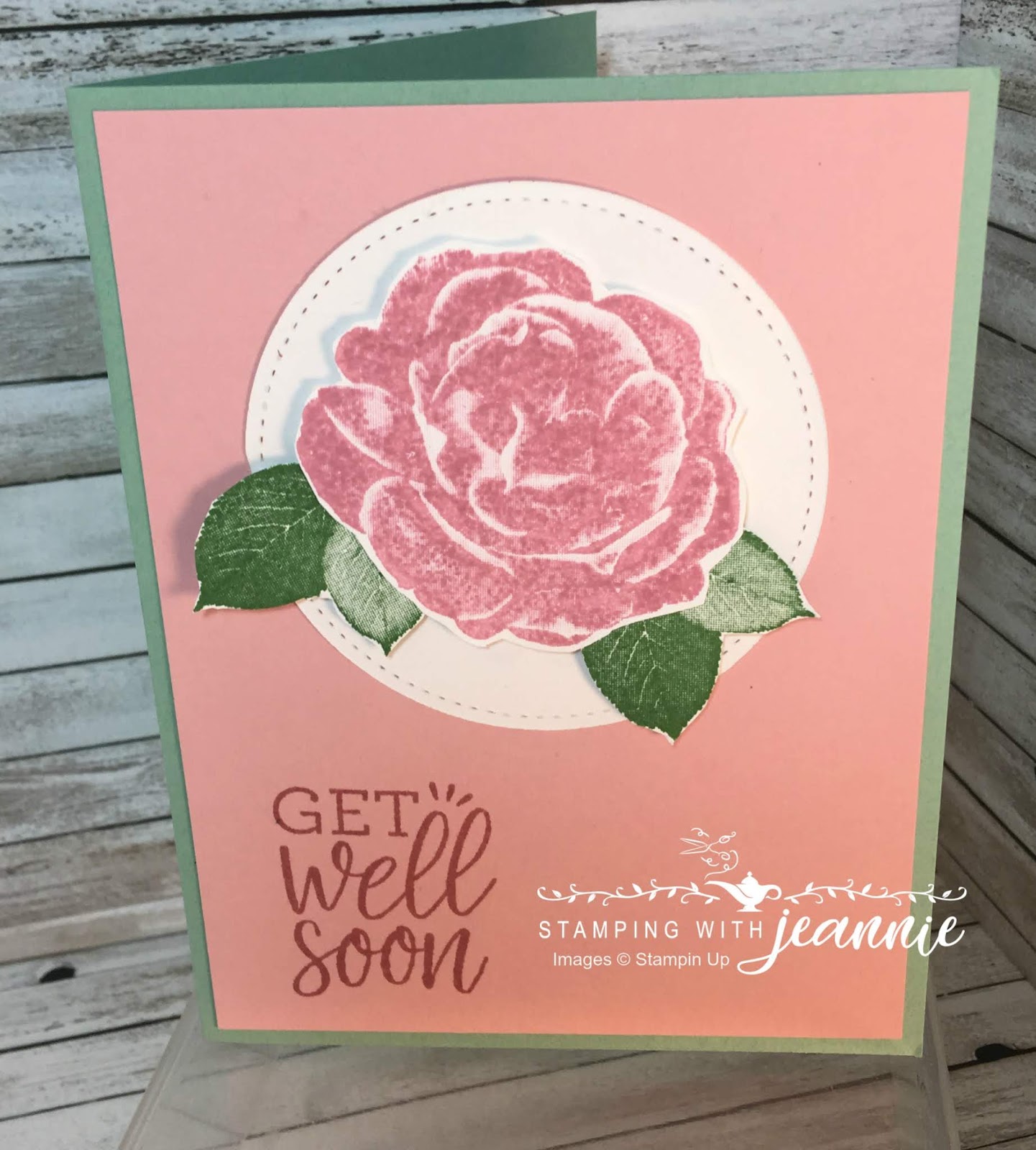 The stamped flower shown here is from the stamp set called Healing Hugs and is such a great thinking of you/get well card. I stamped the image in Rococo Rose ink on a scrap of Whisper White cardstock(c/s), then “fussy-cut” and popped up on the largest Stitched Circle die. I also stamped leaves in Garden Green ink, again on the scrap of Whisper White c/s and again “fussy-cut”. Fussy-cutting involves hand-cutting an image out, rather than using dies – it’s quite possibly the most time consuming part of this entire card!