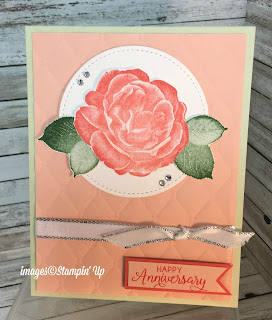 Again, the flower above was stamped with the Healing Hugs stamp set. I think that the ink used was Calypso Coral, but don’t quote me on that! The “piece-de-resistance” is the Petal Pink cardstock layer that is embossed with the Tufted 3D embossing folder! Of course, there are other beautiful elements to this card – the rhinestones, the ribbon, the sentiment layered and popped up!