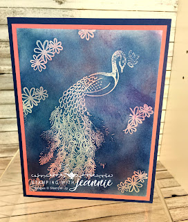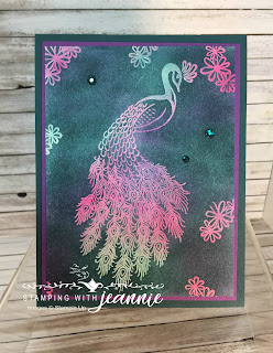 I’ve made 2 cards with Royal Peacock, both slightly different. I’ll put the supply list underneath, and in the description, I’m listing the “under colors” and the “top coat” I’ve sponged onto my Whisper White cardstock. I embossed the peacock with VersaMark ink and used clear embossing powder over the VersaMark. I’m not sure if the colors/cards would turn out differently if I embossed using the white powder?