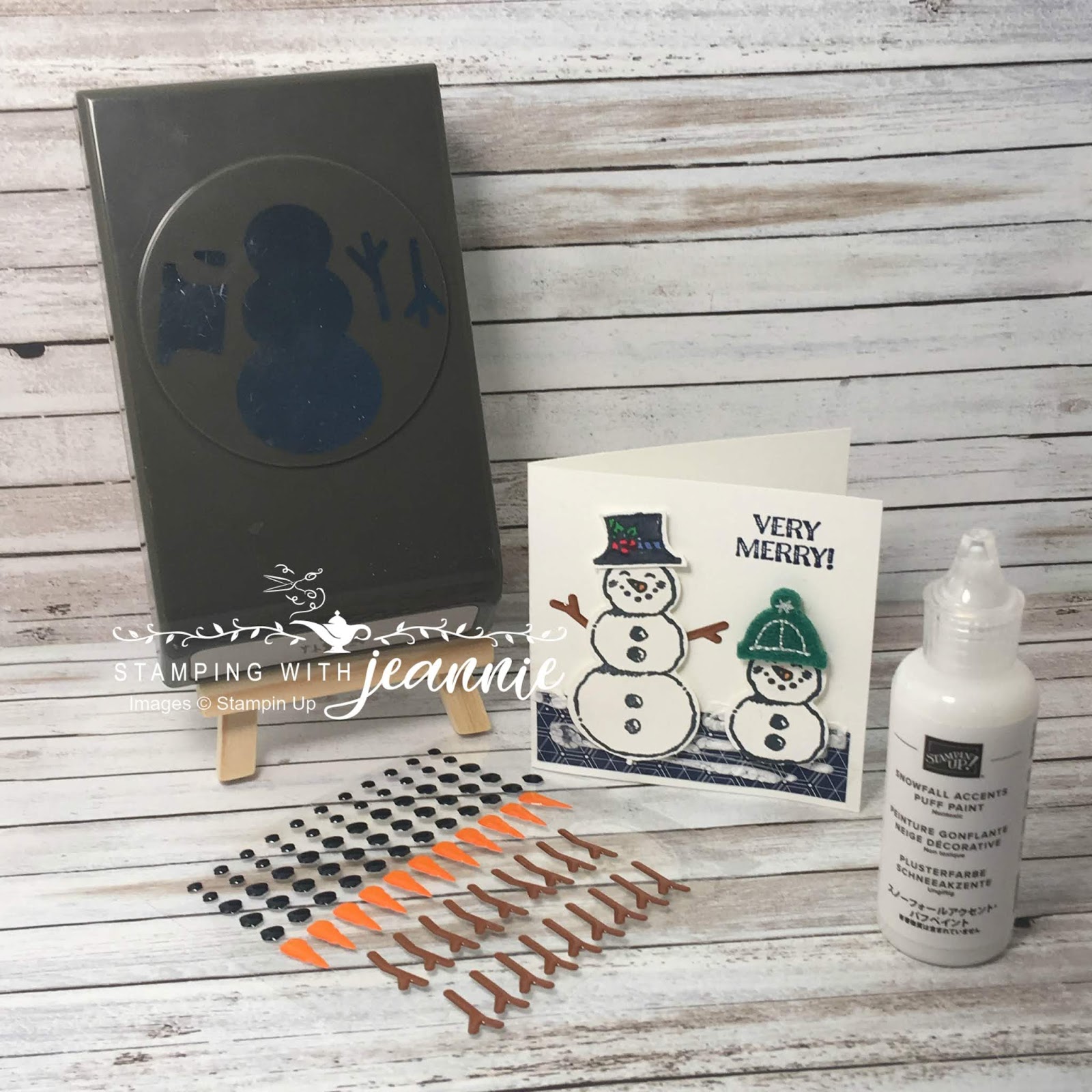 This little gift card features a small strip of the Brightly Gleaming DSP, topped with just a smidge (just a dab ‘ll do ya!) of Puff Paint! I stamped two snowmen, and cut the base off of one to create Junior! Then, all that was left to do was decorate … uh, dress my snowmen! Oh yes, and the tiny greeting is from Itty Bitty Christmas! How fun!