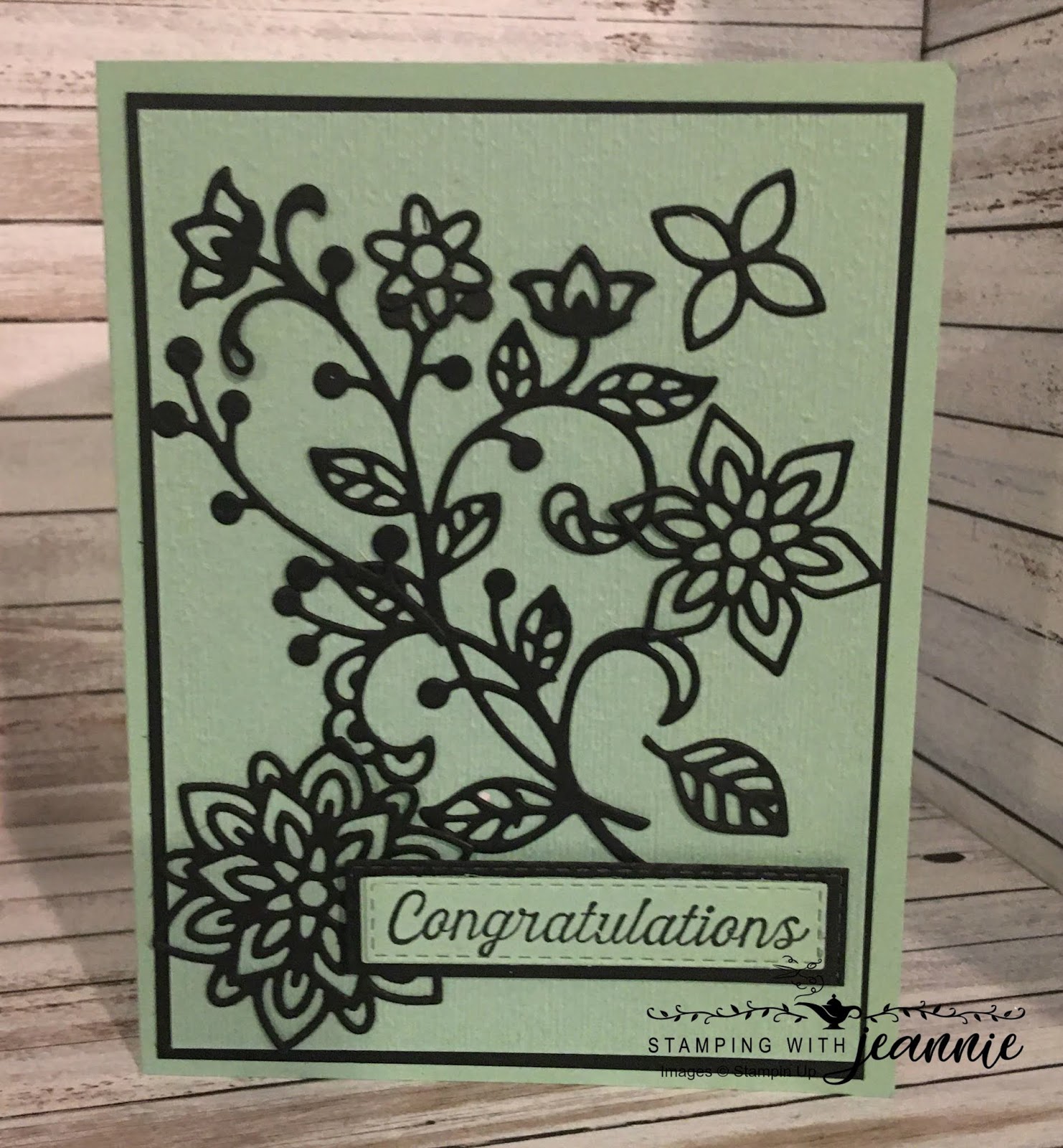 So, here’s my card: Mint Macaron cardstock with Basic Black cardstock mat and Basic Black cardstock diecuts. It was so simple to make — I just took a 4″ x 5 1/4″ piece of Basic Black cardstock, laid out a variety of dies, and cut. The trick to attaching these diecuts is to use a sponge, the liquid glue, and the silicone mat from Stampin’ Up! I’m including the “recipe” for the card along with the supplies below. I hope you’ll consider purchasing this lovely set!