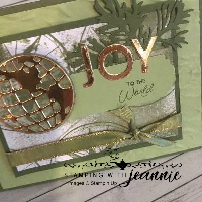 Attach the DSP layer to another Mossy Meadow mat that is 1/4″ larger than the DSP layer (3 1/4″ x 4 1/4″), then attach the pine bough to the top right corner, the label over top of that, approximately the middle of the DSP, then the “world” (brass layer over the cut-out 2nd DSP circle “world”, part of the World Map dies as well), the J-O-Y letters as shown in the photo, with the ribbon knotted around the bottom of these layers. Just pop up the whole layer combo with dimensionals and you’re done!