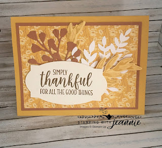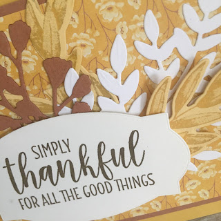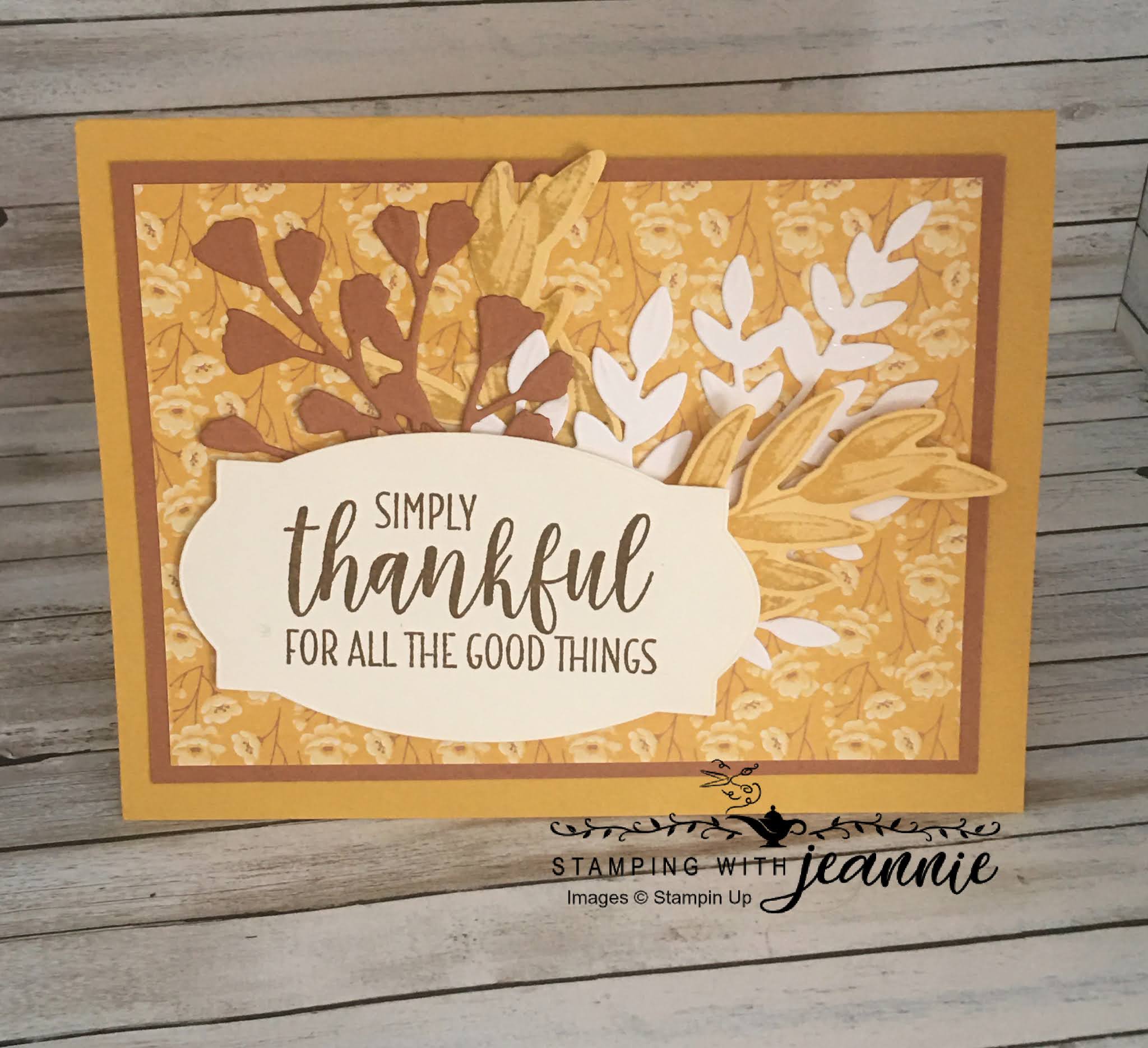 What’s the stamp set you ask? Well, the sentiment is from the Country Home set — but the stamped “wheat” and leaves diecuts are from Forever Fern bundle. Doesn’t it look different?! Just using alternate cardstock colors, the Forever Flourishing dies look completely different. The DSP is from the Flowers for Every Season DSP stack. The DSP is not just flowers for spring and summer!