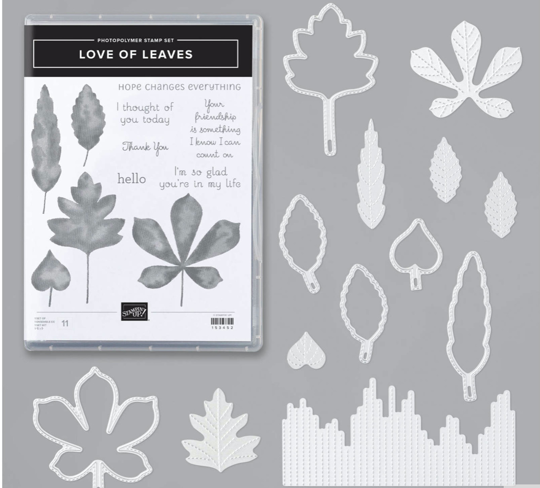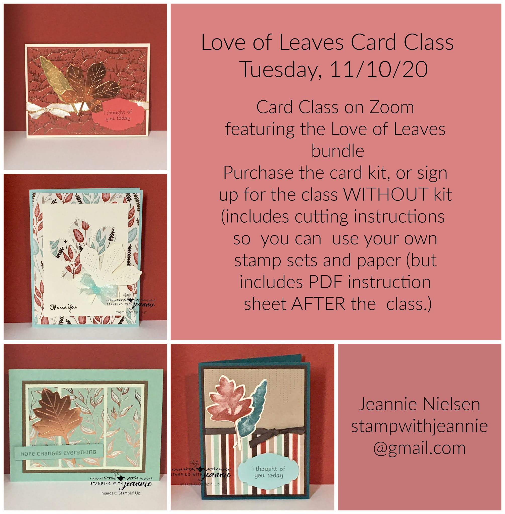 Join me on Tuesday night, 11/10/20 at 7 p.m. on Zoom for some online crafting fun. This card class features the Love of Leaves stamp set and dies. The class is easiest if you already own the Love of Leaves bundle, but with the class kit, you can easily substitute another stamp set. Purchase the card kit (precut cardstock, designer paper, diecut/punched elements, and envelopes) for $25 (porch pickup) or use your own. If using your own stamp sets and paper, cutting instructions will be emailed to you upon receipt of your signup and payment.