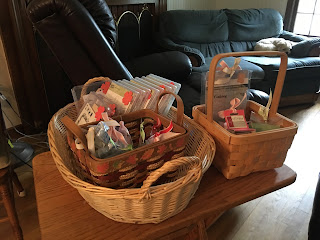 These were some of the giveaways. I was going to do door prizes with tickets, but decided that EVERYONE was a winner! Everyone chose a stamp set, and also got a little bag of ribbon or buttons or single stamps.
